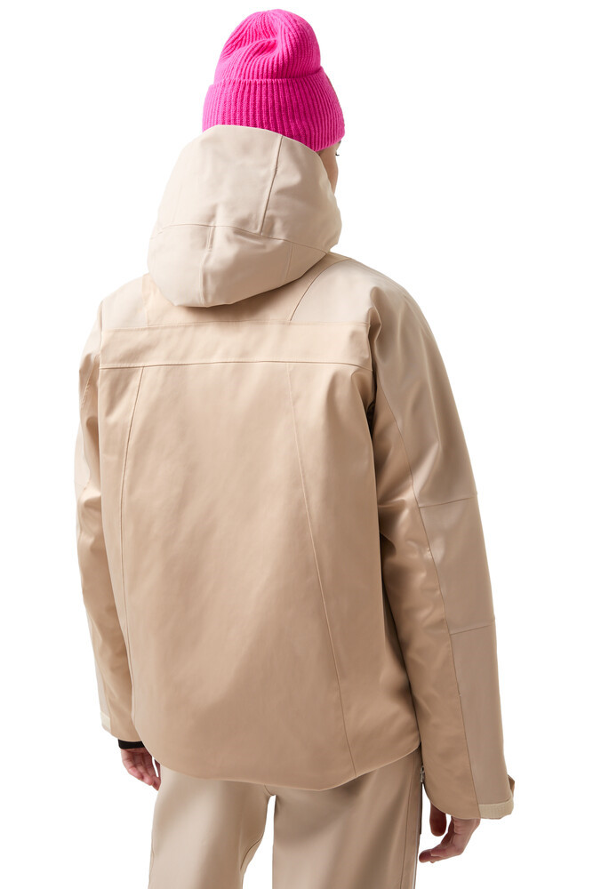 Saténová tkanina charakterizuje lyžařskou bundu Tinka jako stylového společníka pro zimní sporty, který je ikonicky doplněn detaily s logem. Prošívaná vložka, nastavitelná kapuce a podlepené švy v kritických oblastech zajišťují funkční vzhled. Zipové síťované vložky a poutka na palce zajišťují pohodlné dokončení.
