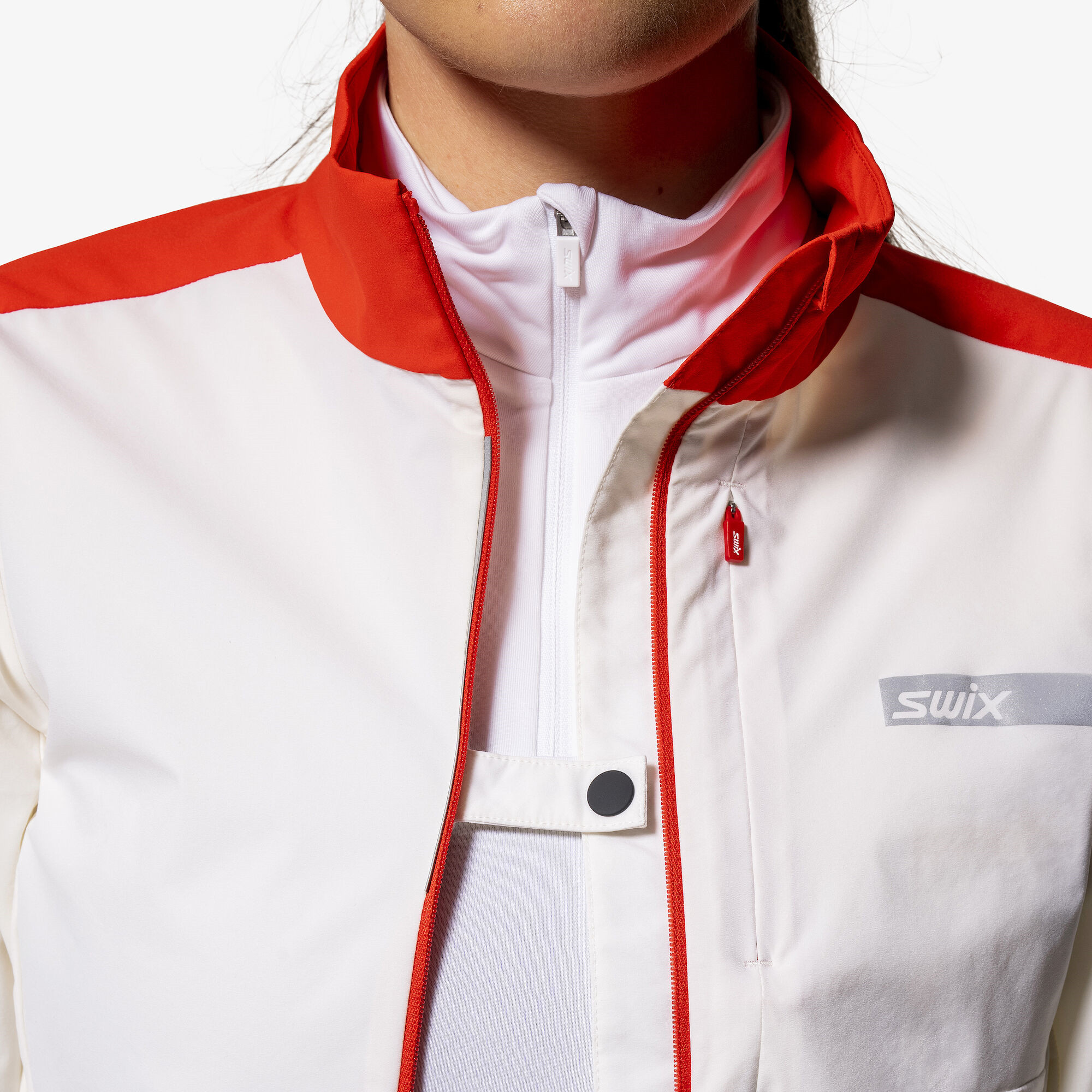 • Bright white/fiery red Bíládetail Dámská bunda Swix Bunda Roadline Wind
