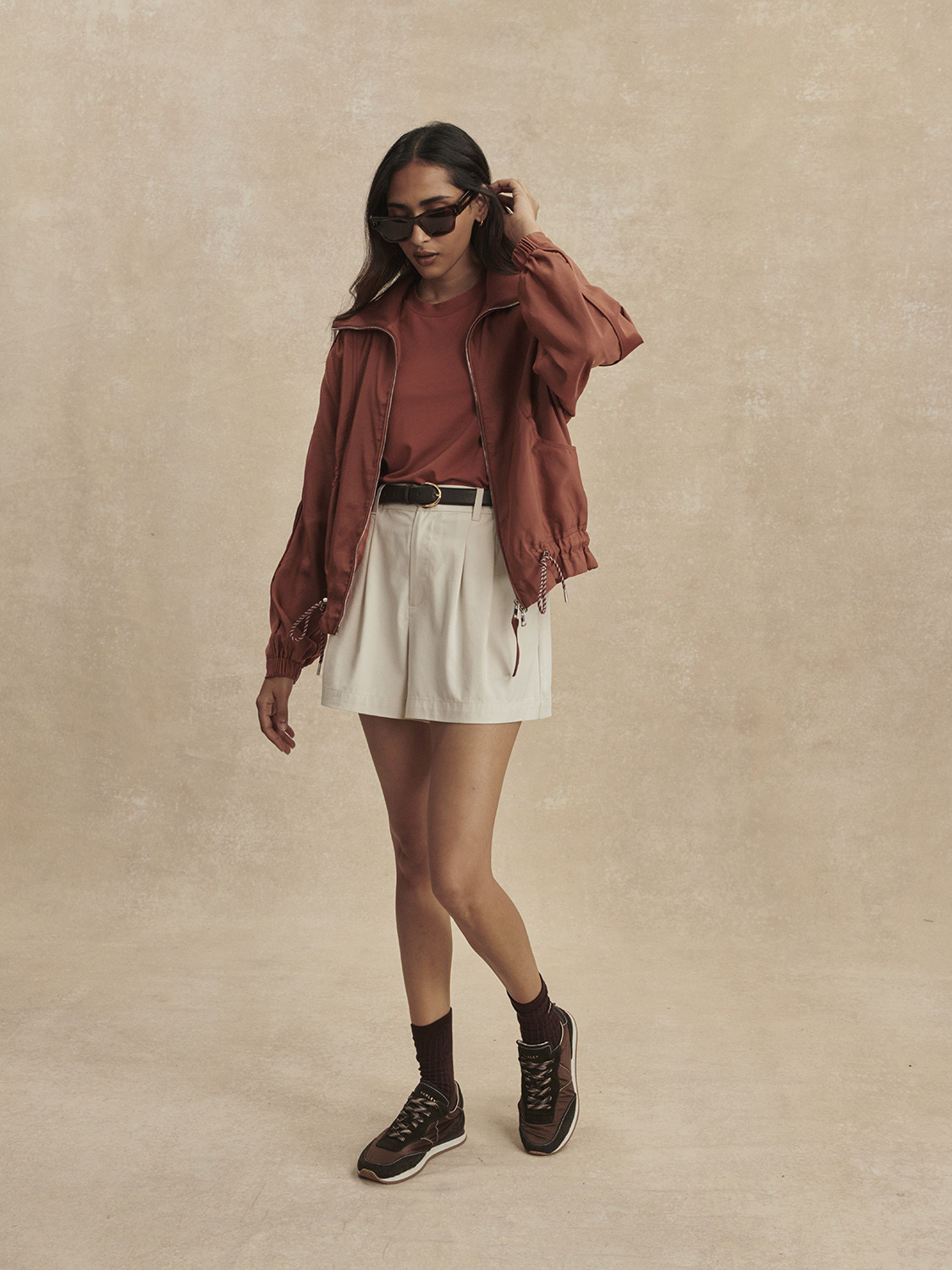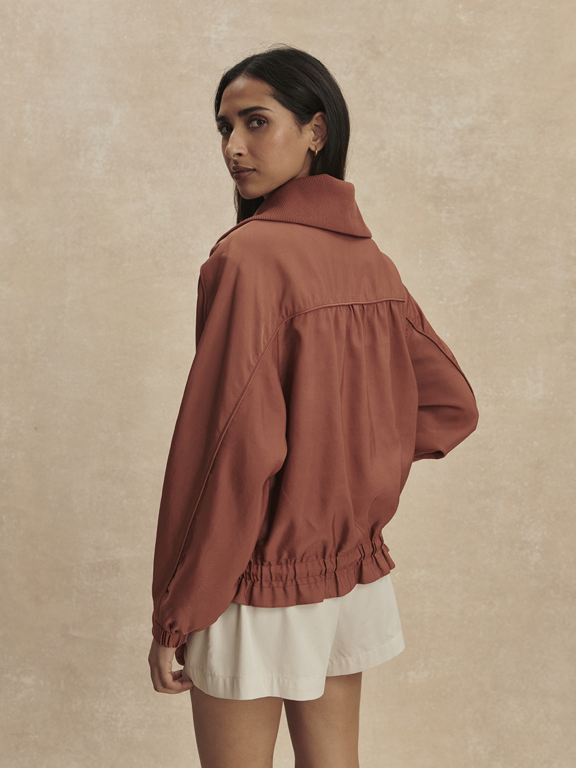 Tato bunda s předním zipem z materiálu Shimmer Twill je dokonalou kombinací pohodlí a elegance. Je navržena v oversized střihu a zdobí ji viditelná stahovací šňůrka s volánkovým lemováním a elegantní lemování podél rukávů, které jí dodává jemný, stylový nádech.