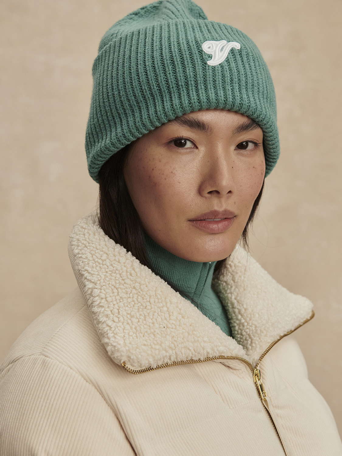 Minimalistická silueta s ohrnutým lemem a decentním logem Varley působí čistě a snadno se kombinuje s kabátem i pufferem.