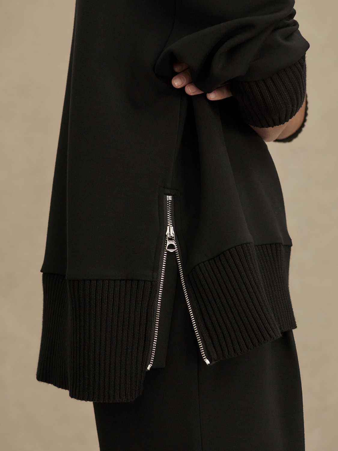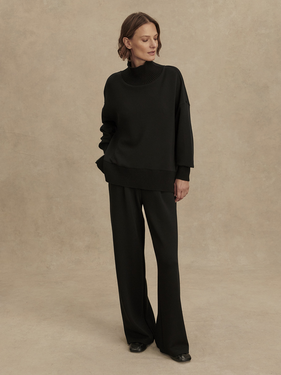 Mikina má volný, mírně boxy střih s vysokým límcem, který dodává sofistikovaný vzhled a zároveň chrání před chladem. Spadlá ramena, široké manžety a jemně prodloužený zadní lem vytvářejí lichotivou siluetu s nenuceným dojmem. Polozip u krku umožňuje přizpůsobit vzhled – zcela zapnutý působí elegantně, rozepnutý uvolněně a sportovně. Barker Sweat se skvěle kombinuje s tepláky, legínami i džíny.