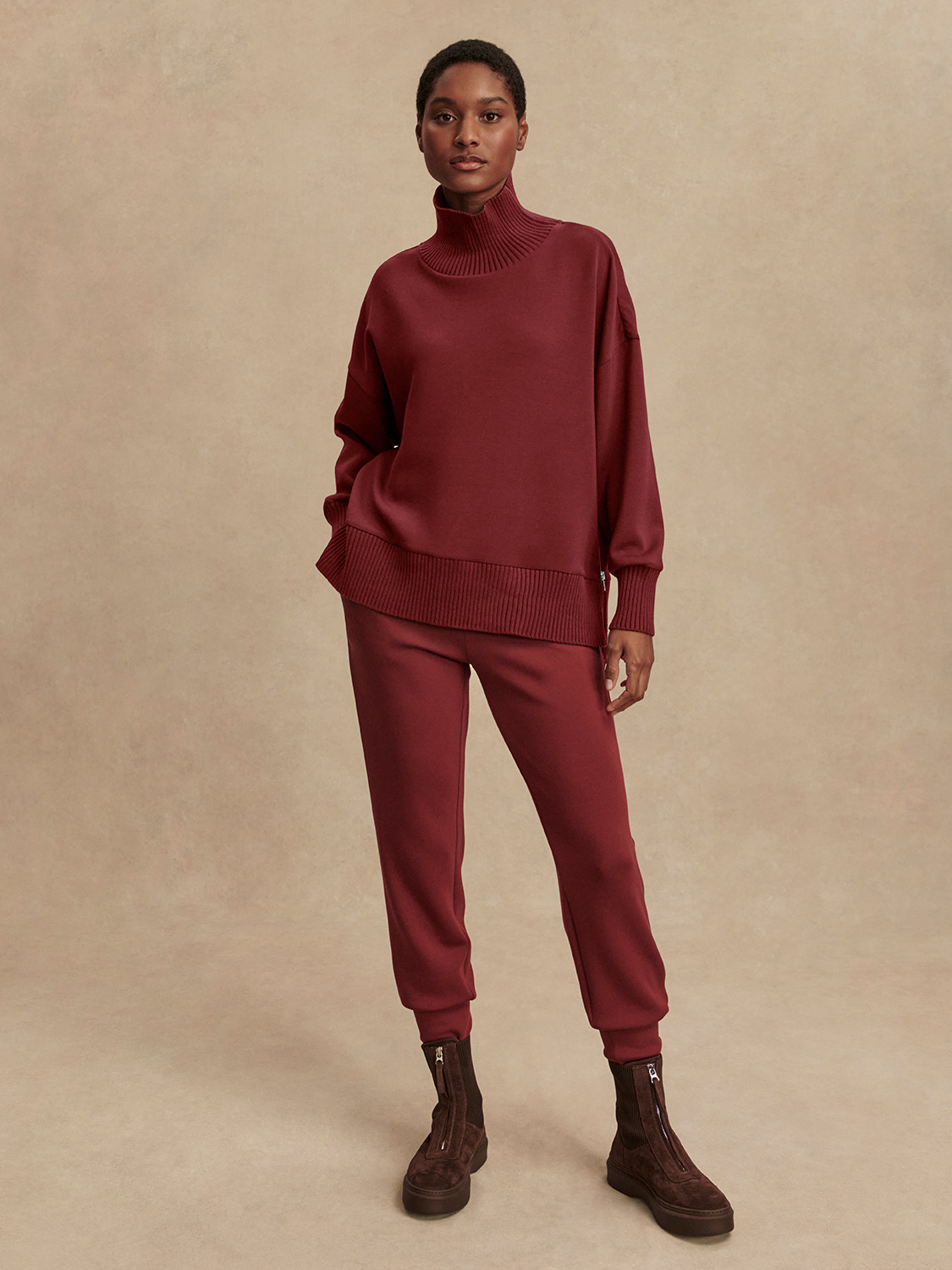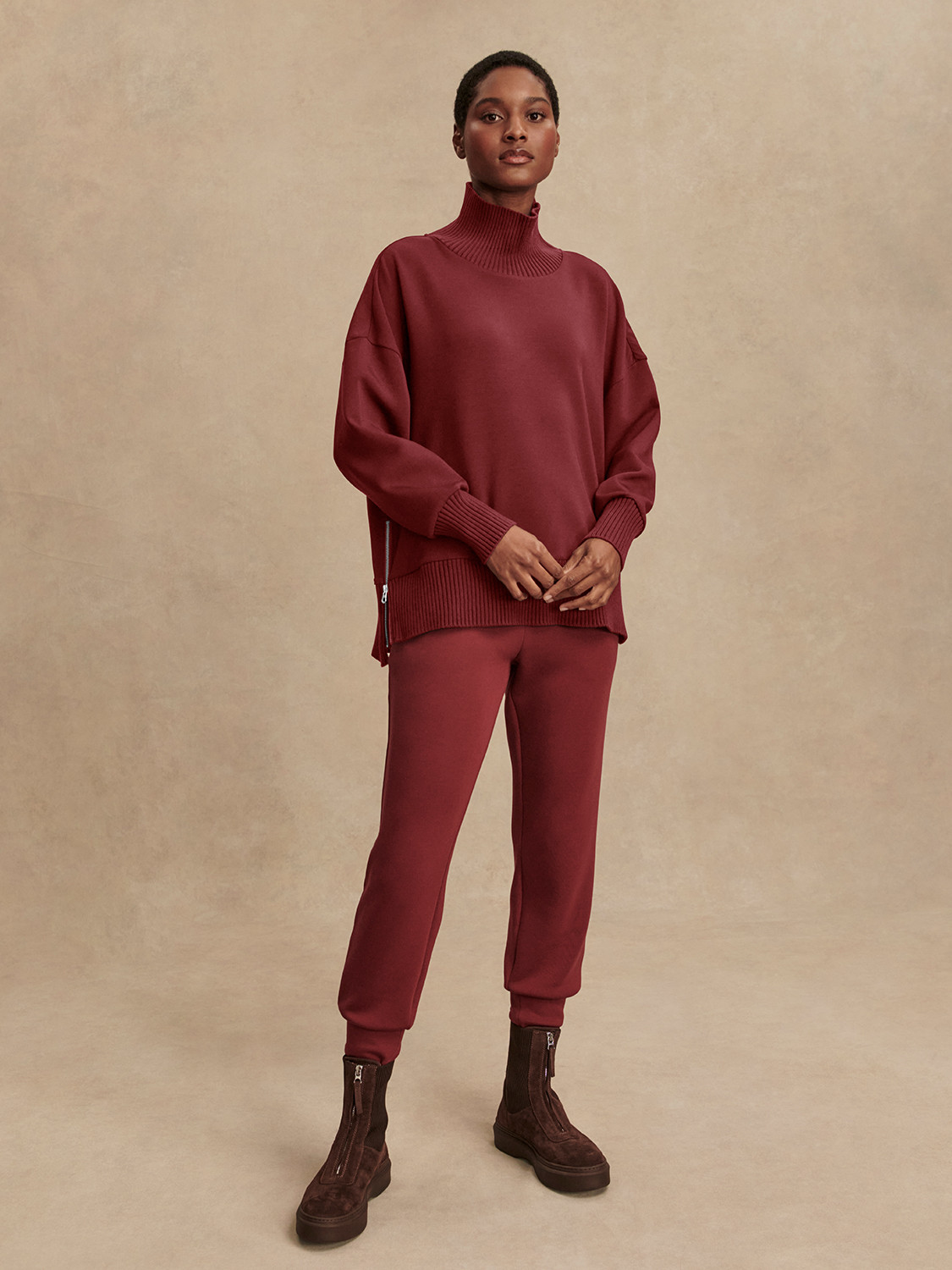 Mikina má volný, mírně boxy střih s vysokým límcem, který dodává sofistikovaný vzhled a zároveň chrání před chladem. Spadlá ramena, široké manžety a jemně prodloužený zadní lem vytvářejí lichotivou siluetu s nenuceným dojmem. Polozip u krku umožňuje přizpůsobit vzhled – zcela zapnutý působí elegantně, rozepnutý uvolněně a sportovně. Barker Sweat se skvěle kombinuje s tepláky, legínami i džíny.