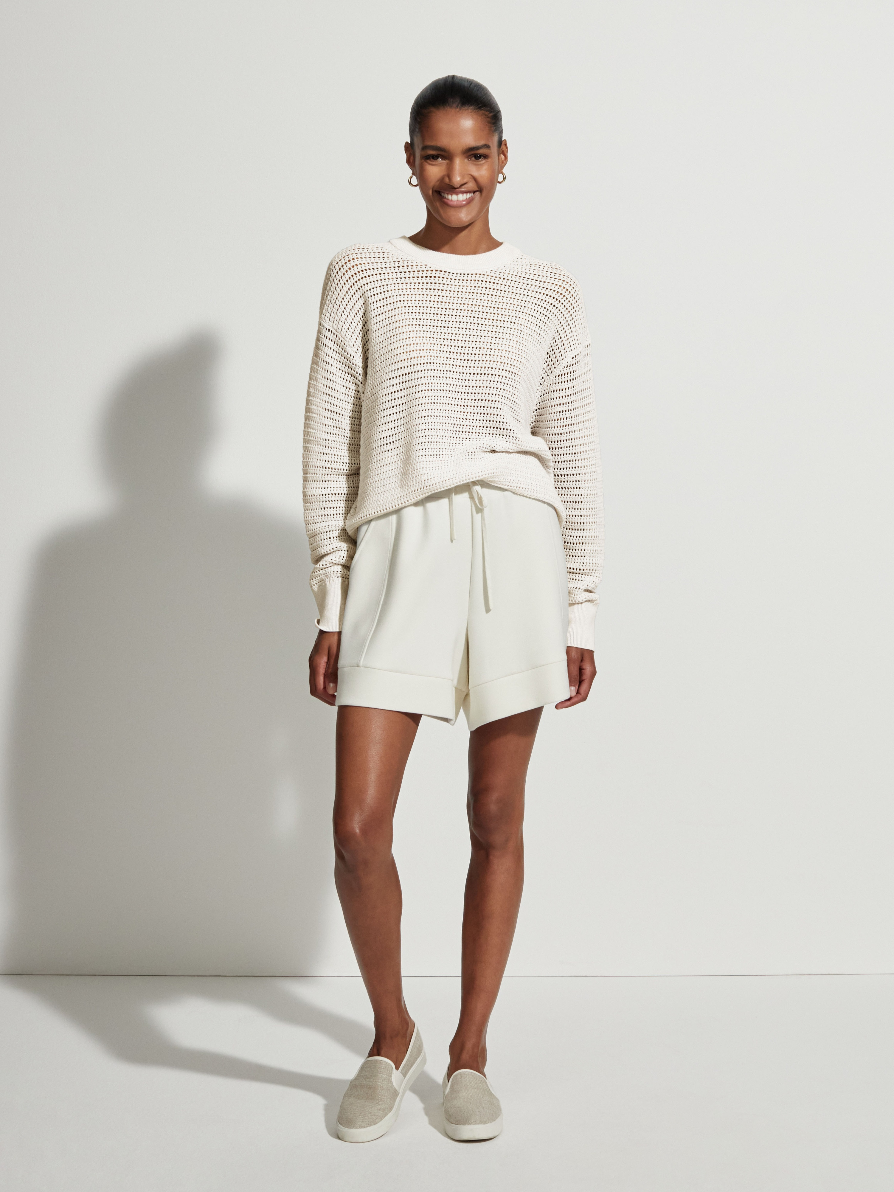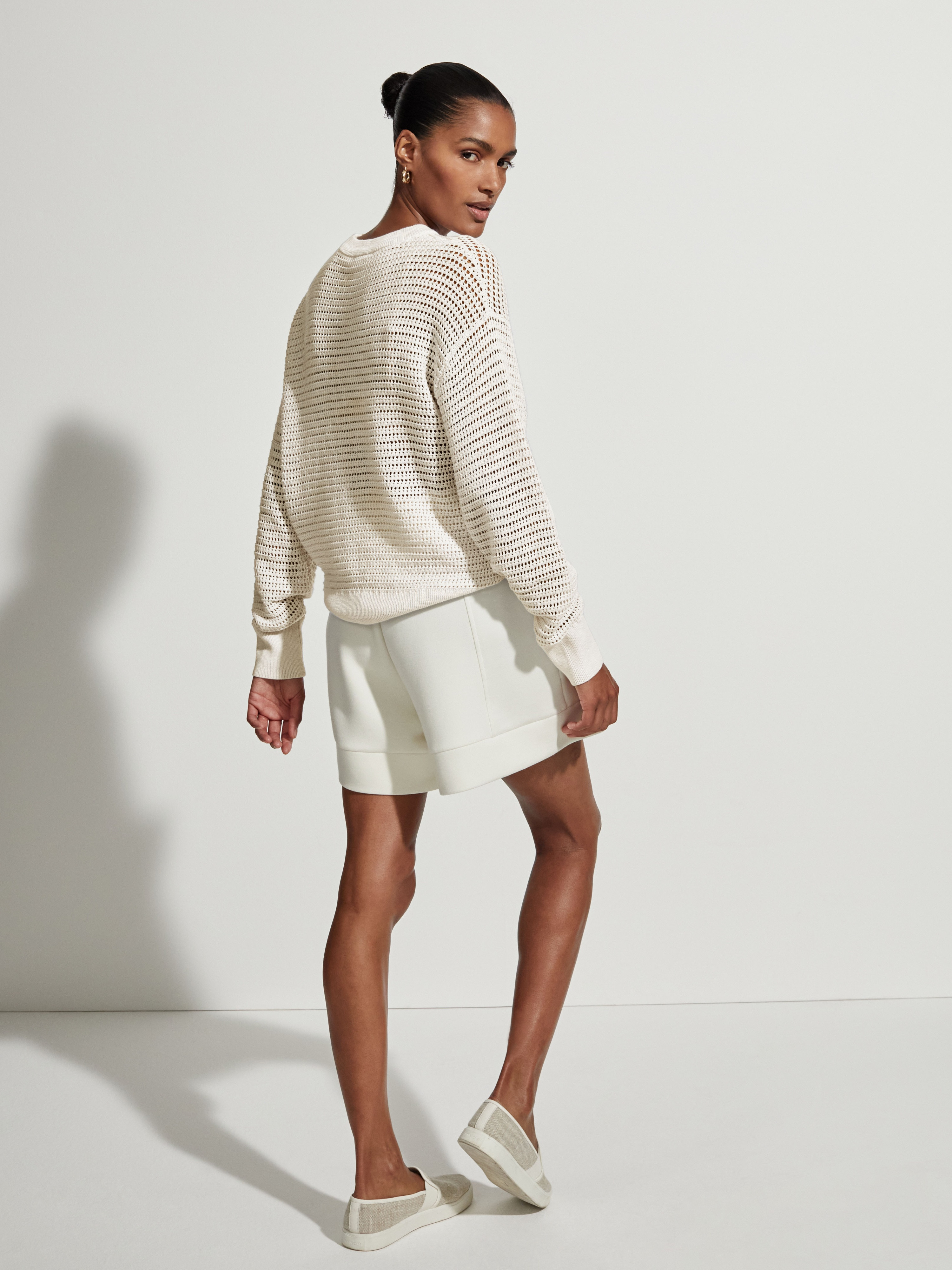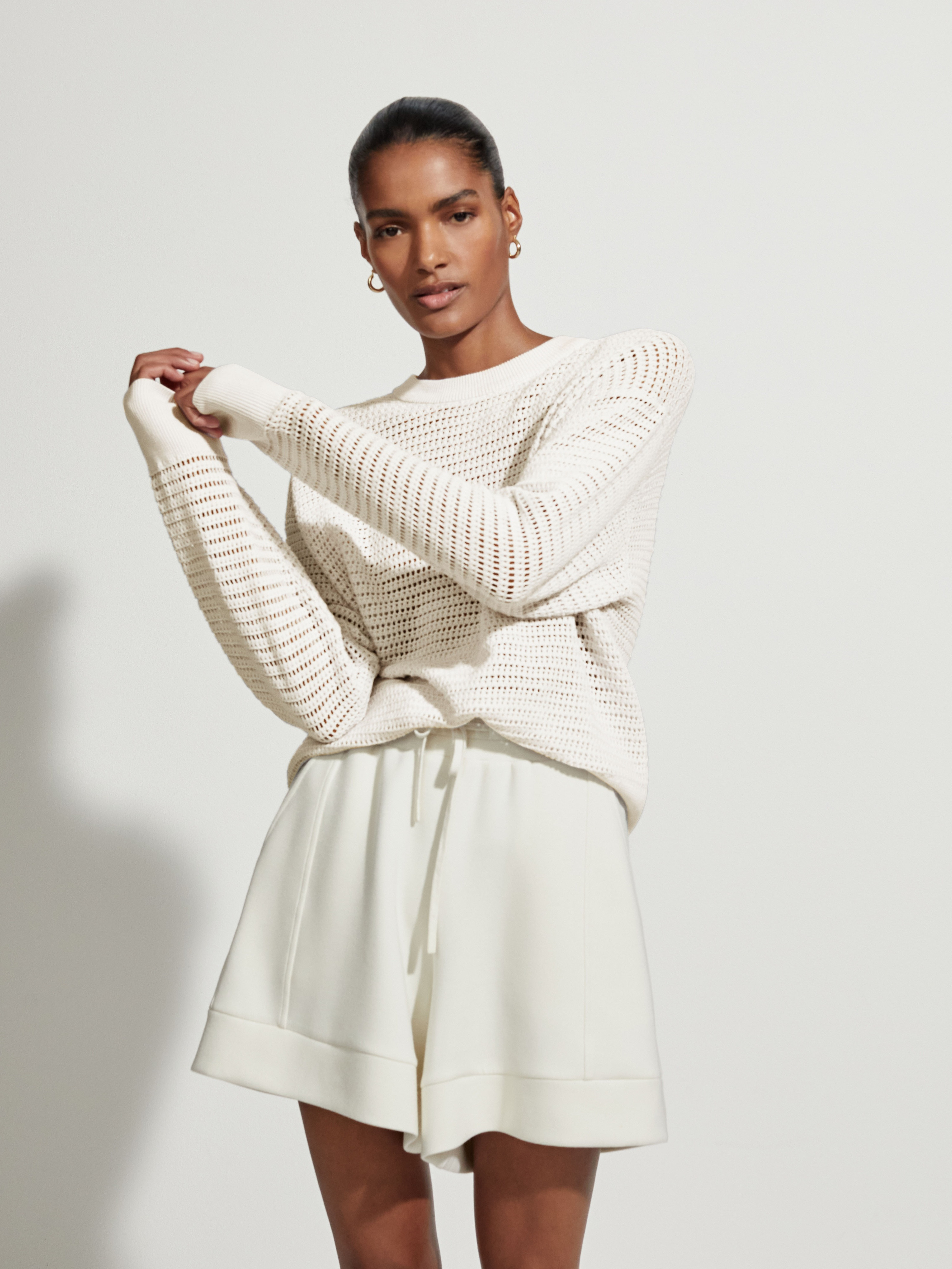 Kershaw je elegantní, zvýšená a snadná svrchní vrstva, ideální pro období, kdy teploty začínají stoupat. Tento moderní střih s výstřihem je vyroben z texturovaného otevřeného úpletu volné siluety a je krásně lehký a prodyšný. Je doplněn žebrovaným lemem a manžetami a lze jej vrstvit na životní styl nebo tenisový vzhled, čímž získáte přechodový vzhled bez námahy. Modelka ve studiu měří 177 cm, má obvod hrudníku 84 cm, pas 58 cm, boky 86 cm a nosí velikost S. Velikost S: Délka od bočního výstřihu k bočnímu lemu je 60 cm. Materiál: 100% Bavlna Prát pouze v ruce, nebělit, nesušit v sušičce, žehlit na nízký stupeň, nečistit chemicky, sušit naplocho.