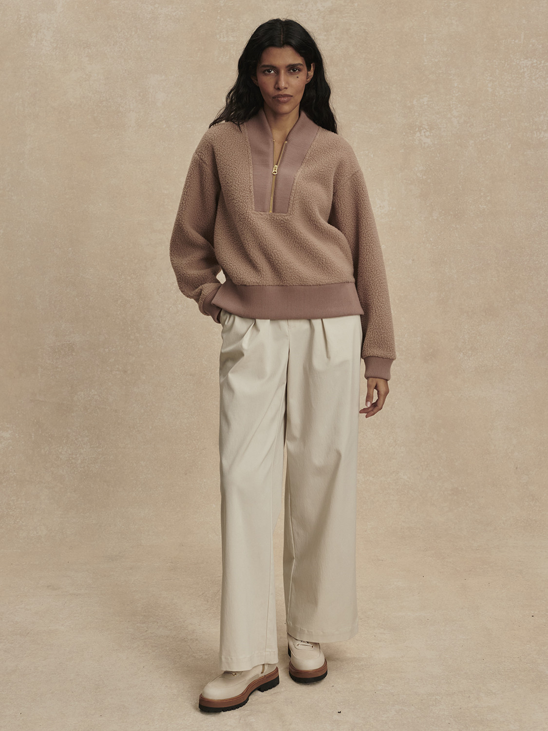 Měkký fleece materiál v kombinaci se zapínáním na poloviční zip vytváří uvolněnou, ale sofistikovanou siluetu typickou pro značku Varley. Mikina působí sportovně i minimalisticky zároveň a snadno se přizpůsobí různým stylům nošení – od aktivního dne až po klidné chvíle ve městě nebo na cestách.