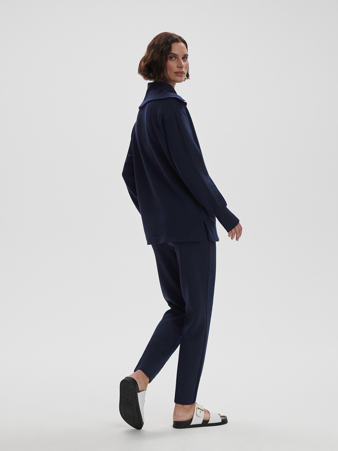 72 % viskóza, 23 % polyester, 5 % elastan. Praní v pračce. Zapínání na zip vpředu. Boční šikmé kapsy. Středně těžká žerzejová tkanina.