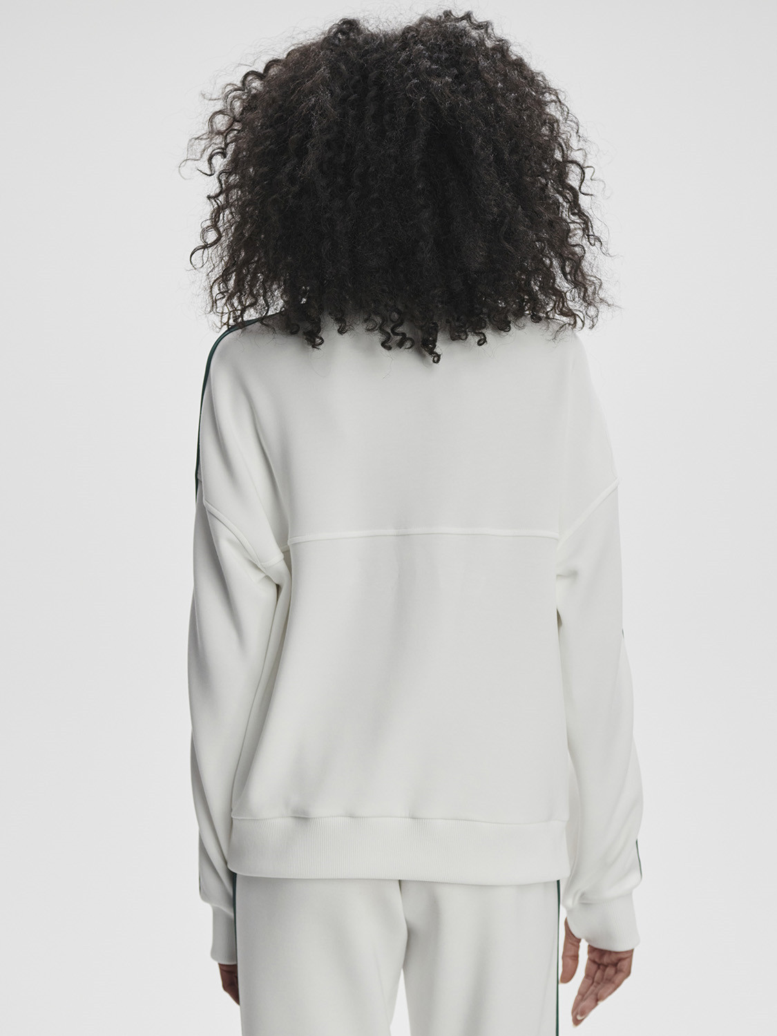 Tato mikina volného střihu má kontrastní pruhované detaily na pažích a otvory na palce, které působí decentně a aktivně. Mikina je zakončená spadlými rameny a je ideální pro vrstvení nebo samostatné nošení.