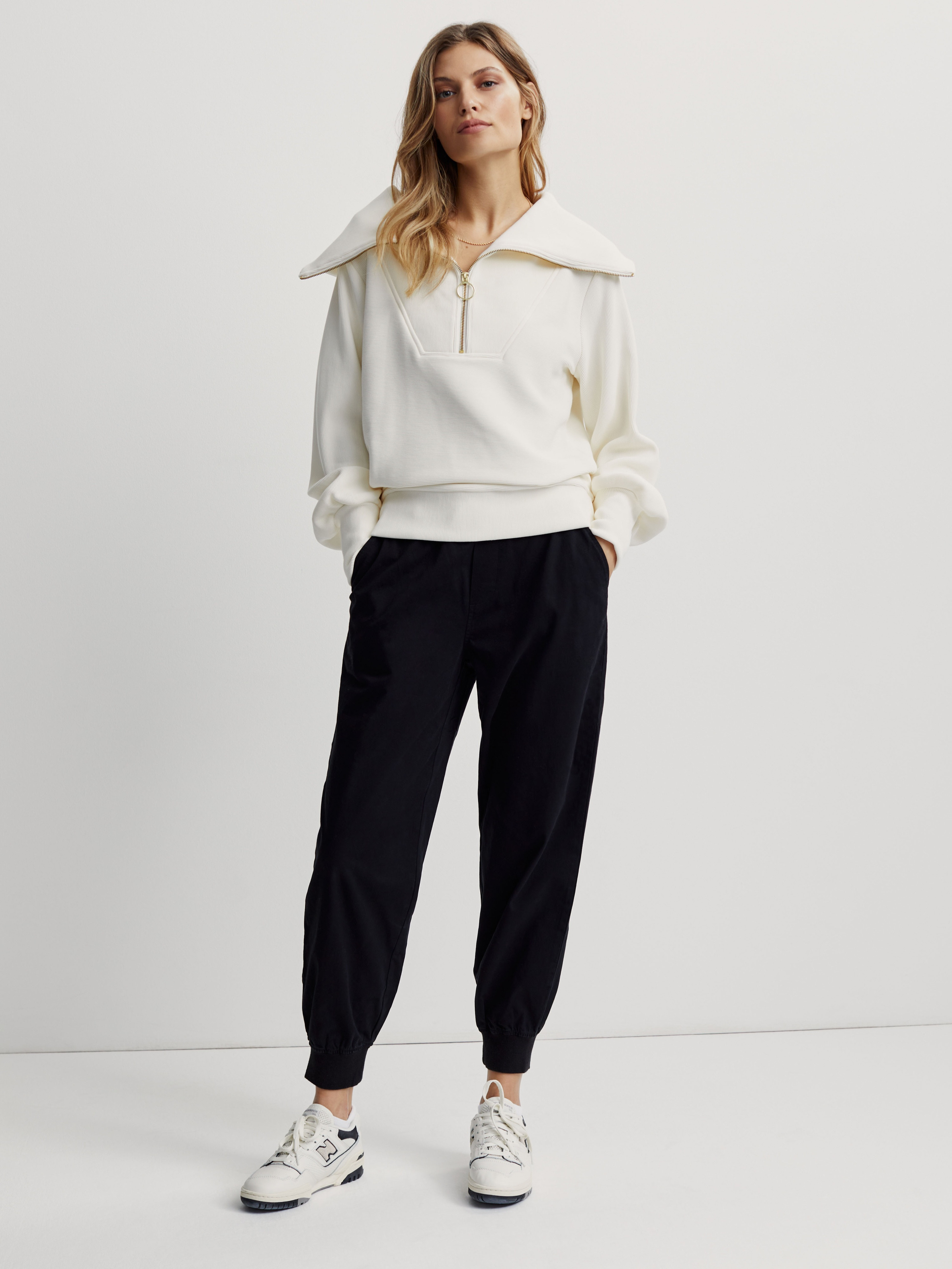 Tento univerzální pulovr s polovičním zipem je vyroben z našeho klíčového materiálu Ottoman rib, má vysoký oversized límec, přehnané rukávy a moderní kroužkový zip. Je navržen jako oversized, takže ho můžete nosit přes legíny nebo tepláky a dosáhnout tak požadovaného vzhledu.