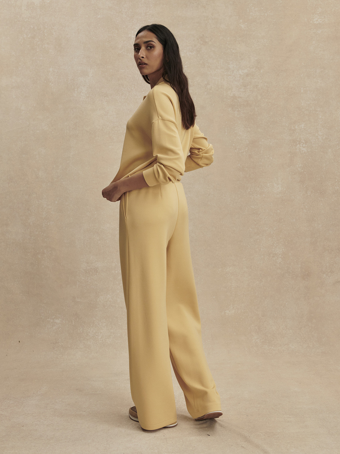 Představujeme kalhoty Extra Wide Leg. Jsou vyrobeny z charakteristické tkaniny DoubleSoft® a oproti klasickému střihu Wide Leg nabízejí ještě větší objem nohavic. Délka vnitřního švu (inseam): 75 cm (doporučeno pro výšku postavy přibližně 163–170 cm) Univerzální volba pro každodenní styling. Tyto kalhoty přinášejí elegantní siluetu s extra širokými nohavicemi, kterou podtrhuje vysoký pas a sklady v přední části. Jsou vyrobeny z naší charakteristické tkaniny DoubleSoft® a doplněny plně elastickým pasem a kapsami, takže dokonale propojují maximální pohodlí s elegancí. Kalhoty Extra Wide-Leg Pant mají standardní střih s extra širokými nohavicemi. Doporučujeme zvolit vaši běžnou velikost. Modelka ve studiu měří 180 cm a má míry 81 cm přes prsa, 60 cm v pase, 89 cm přes boky, na sobě má velikost S. Velikost S: výška sedu (přední): 32 cm délka vnitřního švu (inseam): 75 cm Složení: 81 % viskóza, 15 % polyester, 4 % elastan Péče: Prát na nízkou teplotu, nebělit, nesušit v sušičce, nečistit chemicky, žehlit na nízkou teplotu. Prát s podobnými barvami, před praním otočit naruby, zavázat šňůrky, po vyprání ihned vyjmout z pračky a sušit naležato.
