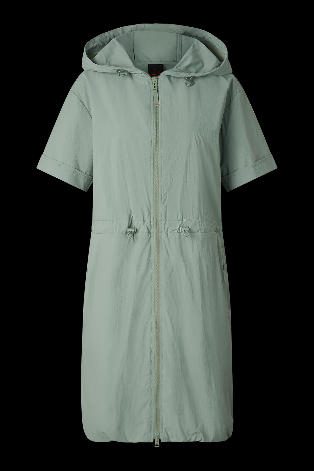 Střední délka; Funkční šaty v regular střihu; Pevná kapuce se stahovací šňůrkou a zarážkami; Krátké rukávy; Pevné manžety; Dvoucestný zip po celé délce s přívěskem B; Dvě boční kapsy s drukem; Textilní nášivka FIRE+ICE na kapuci; Mírně snížená