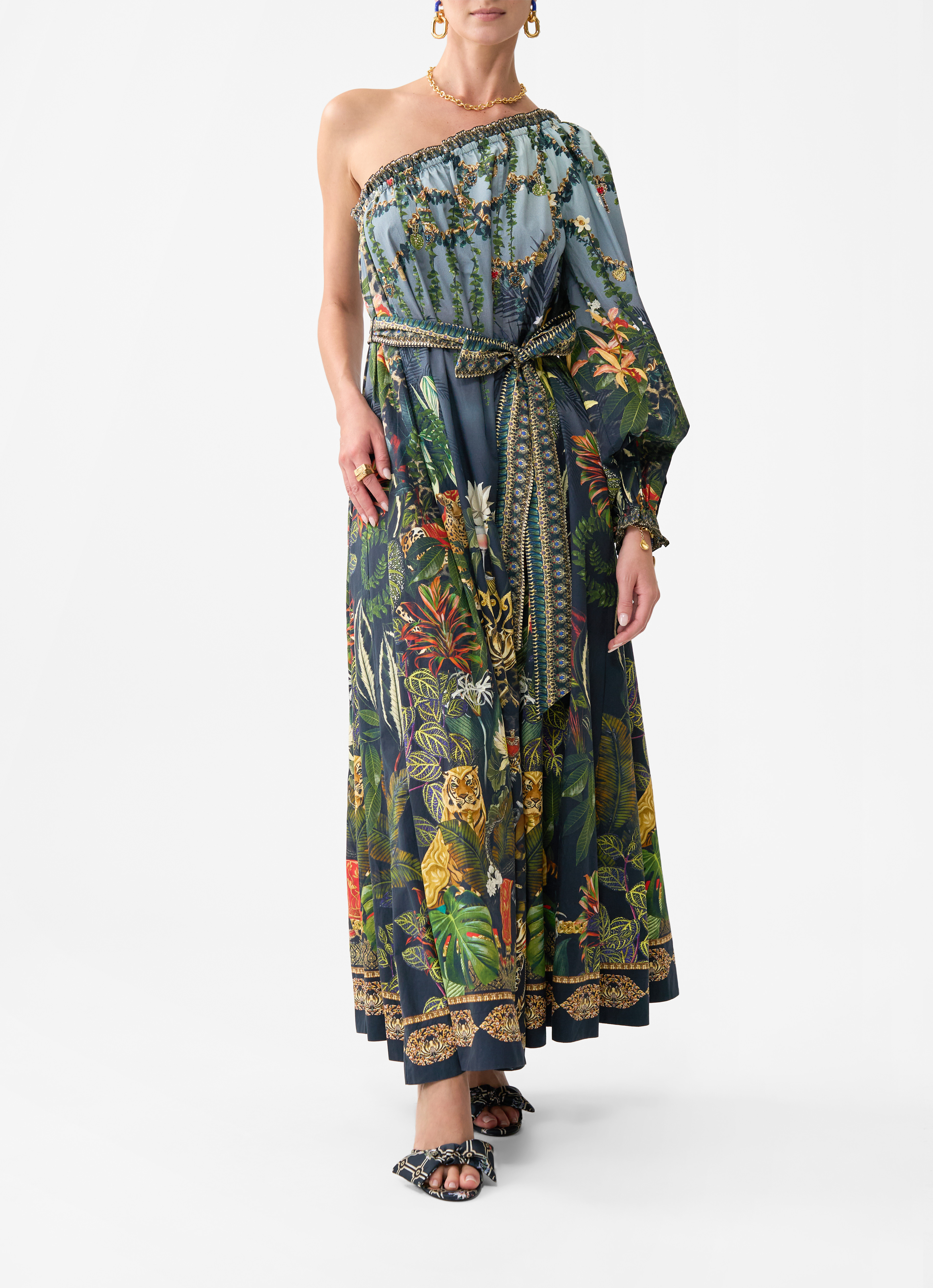 Šaty Ready For My Welcome Drink One Shoulder Dress With Blouson Sleeve navržené v Austrálii vás zavedou do Bílého lotosu, kde se prolínají exotické květy a nezkrotná divoká příroda a vytvářejí tajemnou tapiserii, která evokuje mystiku globálního objevování. Tyto luxusní šaty na jedno rameno, s láskou ručně vyráběné, mají uvolněnou siluetu ve tvaru písmene A, která spadá do celoplošného lemu. Pružný výstřih ve spojení s blůzovým rukávem, který se shrnuje do zápěstí, vytváří elegantně plastickou linii.
