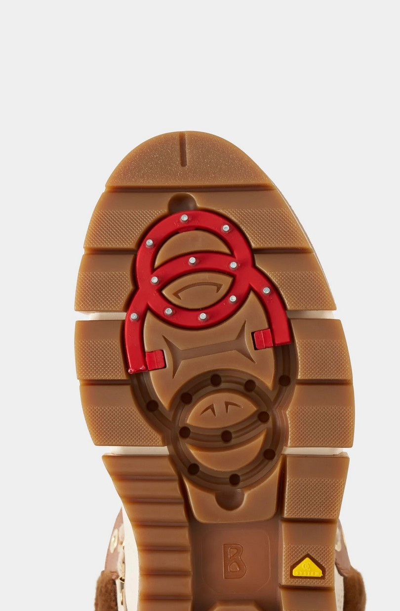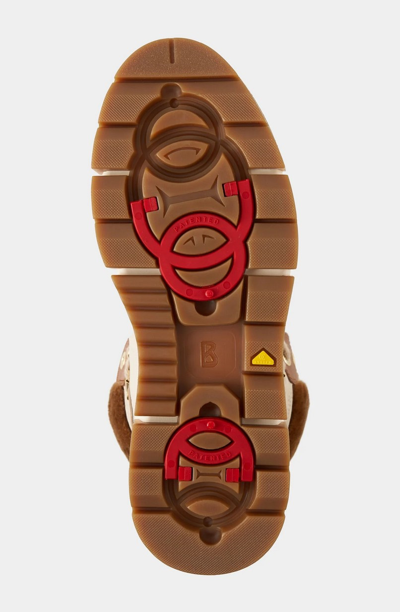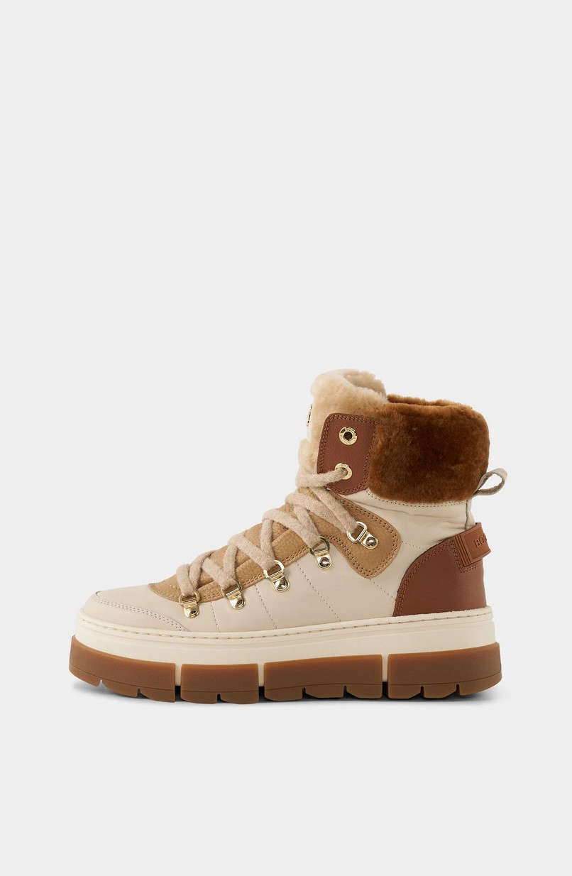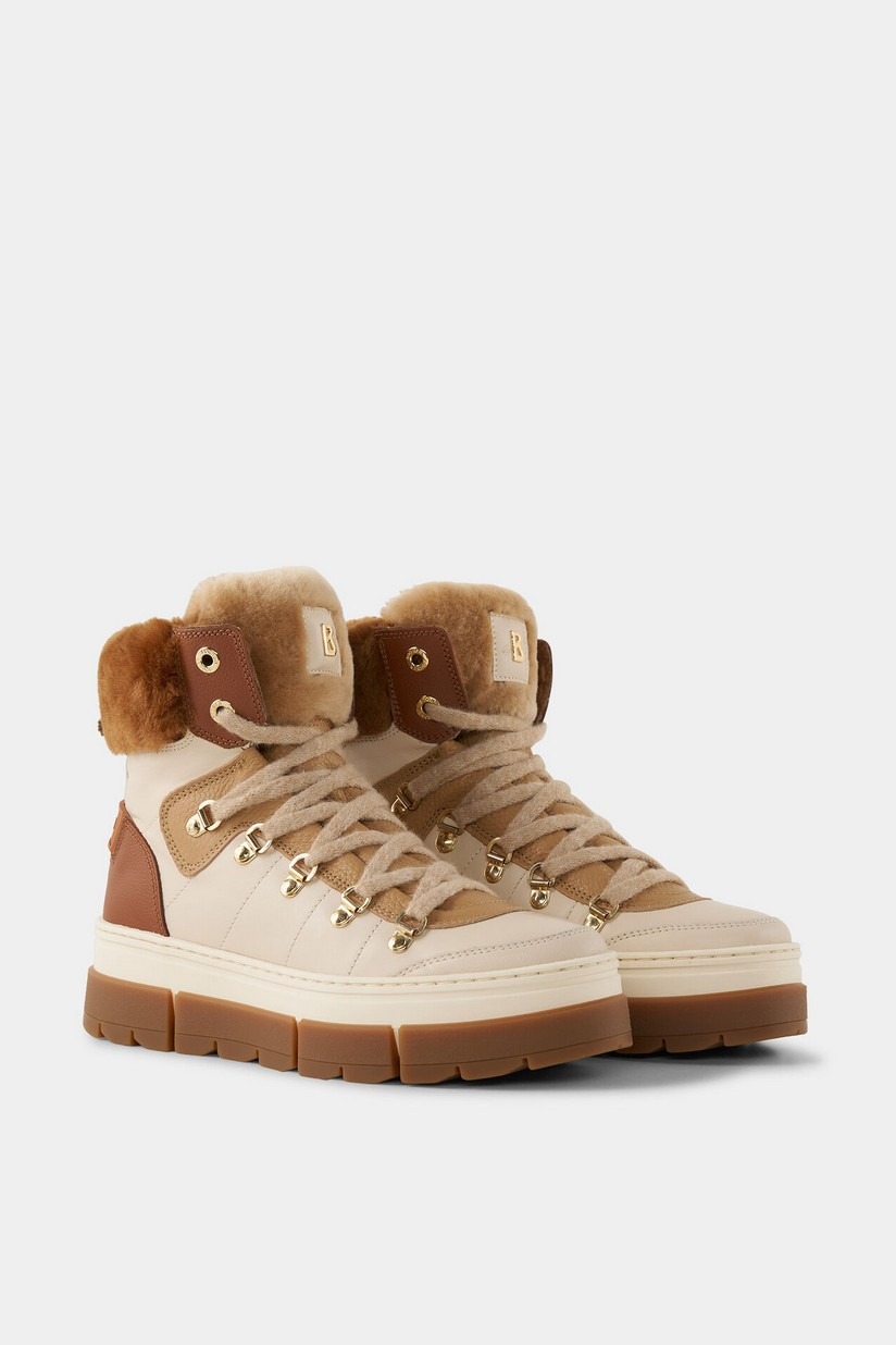 Vysoce kvalitní obuv s odolnou TPU (termoplastický polyuretan) podrážkou, svrškem kombinujícím pravou kůži a shearling, a hřejivou podšívkou z pravého beránka (shearlingu). Středně vysoké boty Vaduz v kombinaci hladké a strukturované kůže s ovčí kůží a vnitřkem z jehněčí kůže mají luxusní nádech, který funkčně doplňuje gumová podrážka a šněrování s očky. Integrované hroty zajišťují pohodlné vylepšení. Detaily: Kožené boty v kombinaci stylů s ovčí kůží Sedminásobné šněrování Středně vysoká špička a zaoblená špička B-gumová nášivka na jazyku boty Gumový pásek na patě Vnitřek z jehněčí kůže Vyjímatelná stélka Výška boty: 13 cm Šířka boty: 9 cm Podešev s gumovým vzorkem Sklopné hroty pro bezpečnou přilnavost na sněhu Výška platforma (vpředu): 2 cm Výška podpatku: 2,5 cm Včetně tašky na boty s logem Vyrobeno v Itálii Design z čisté kůže v kombinaci stylů s ovčí kůží Extra měkká vložka z jehněčí kůže Podešev z TPU gumy s patentovaným systémem hrotů: protiskluzový systém OC SYSTEM®TIPPER pro stabilitu a přilnavost na zamrzlém povrchu