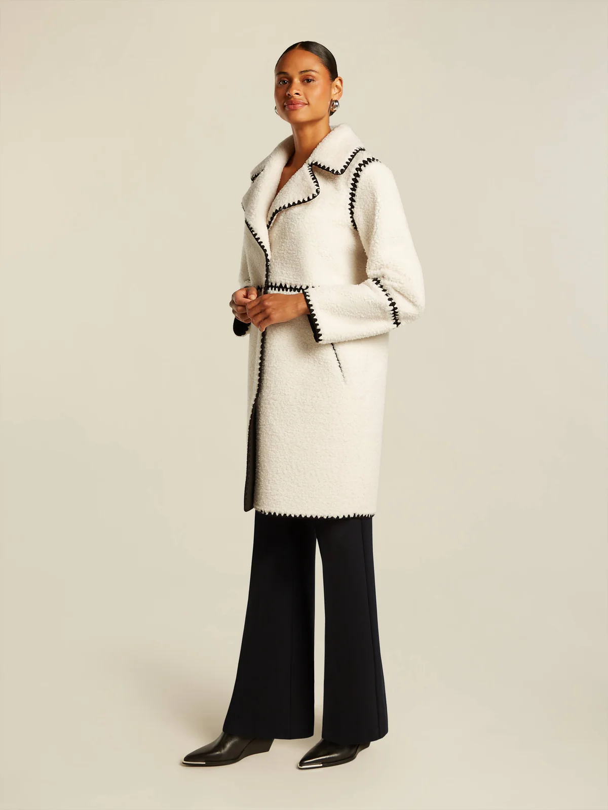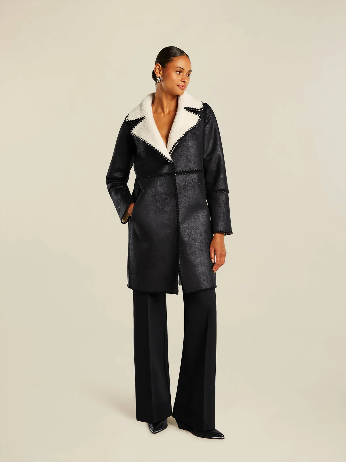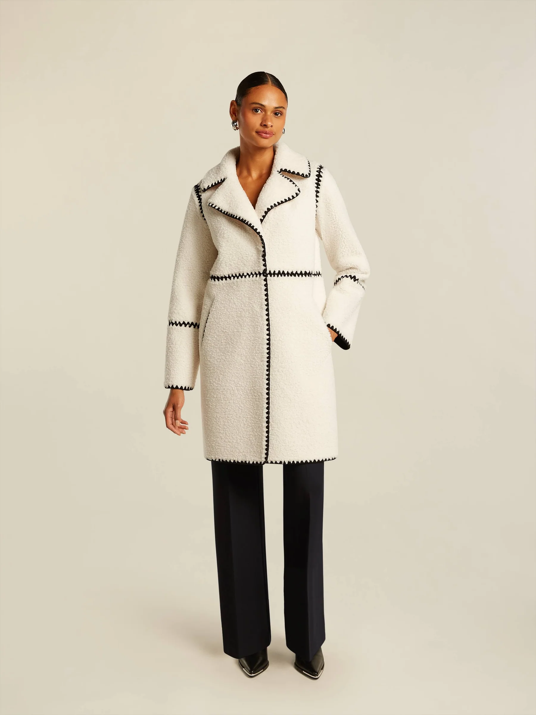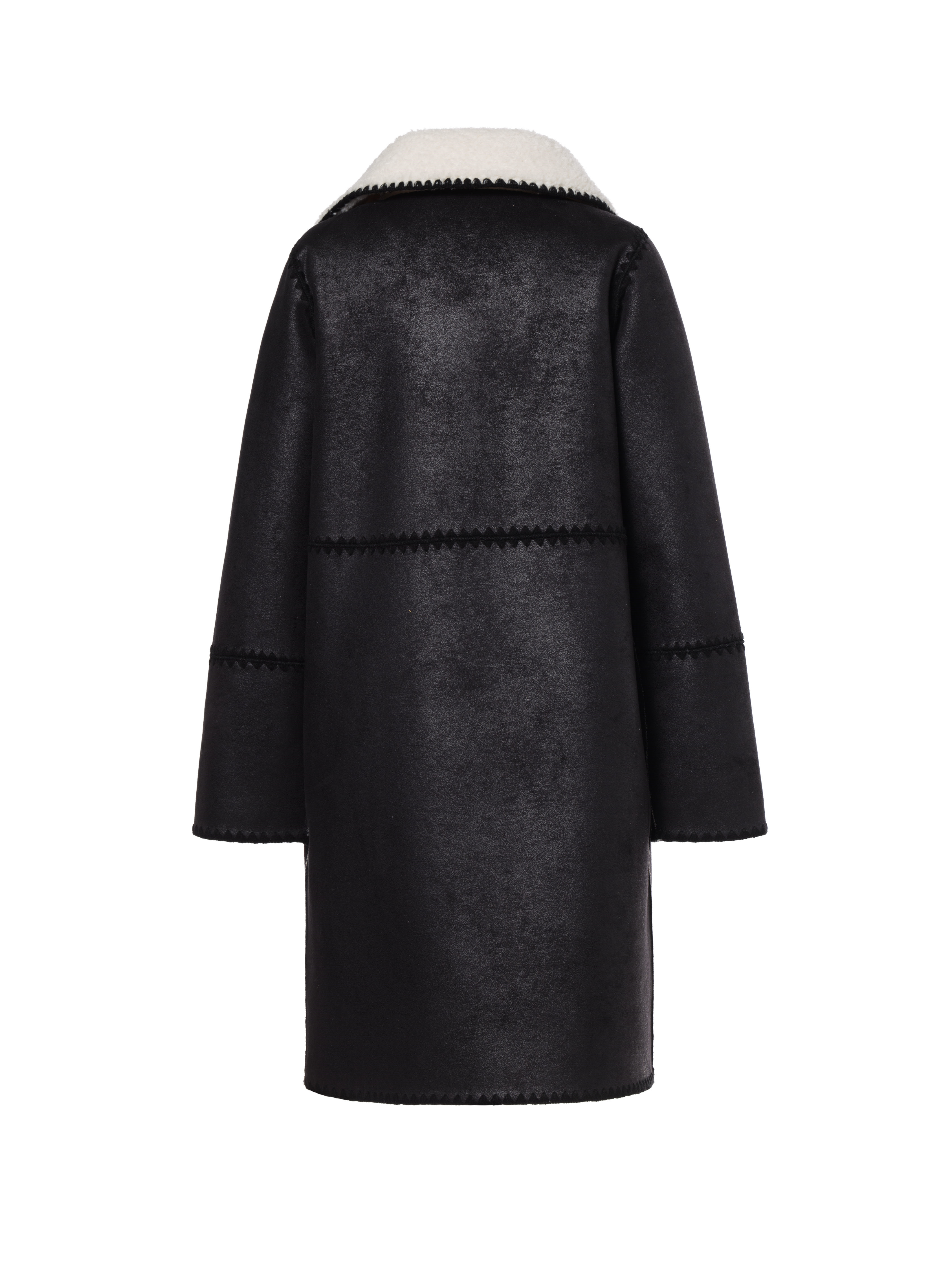Měkký medvídkový oboustranný kabát s vyšívanými černými kontrastními detaily Laminovaný černým semišem Lze nosit z obou stran Kapsy s rozparkem na přední straně Zapínání vpředu na skryté knoflíky Délka zadního středu: 95 cm Materiál: 100 % recyklovaný polyester (umělá kožešina) 100 % polyester (umělý semiš) Střih: Tento model má regular střih Péče: neprát, nebělit, nesušit v sušičce, nežehlit Chemické čištění P