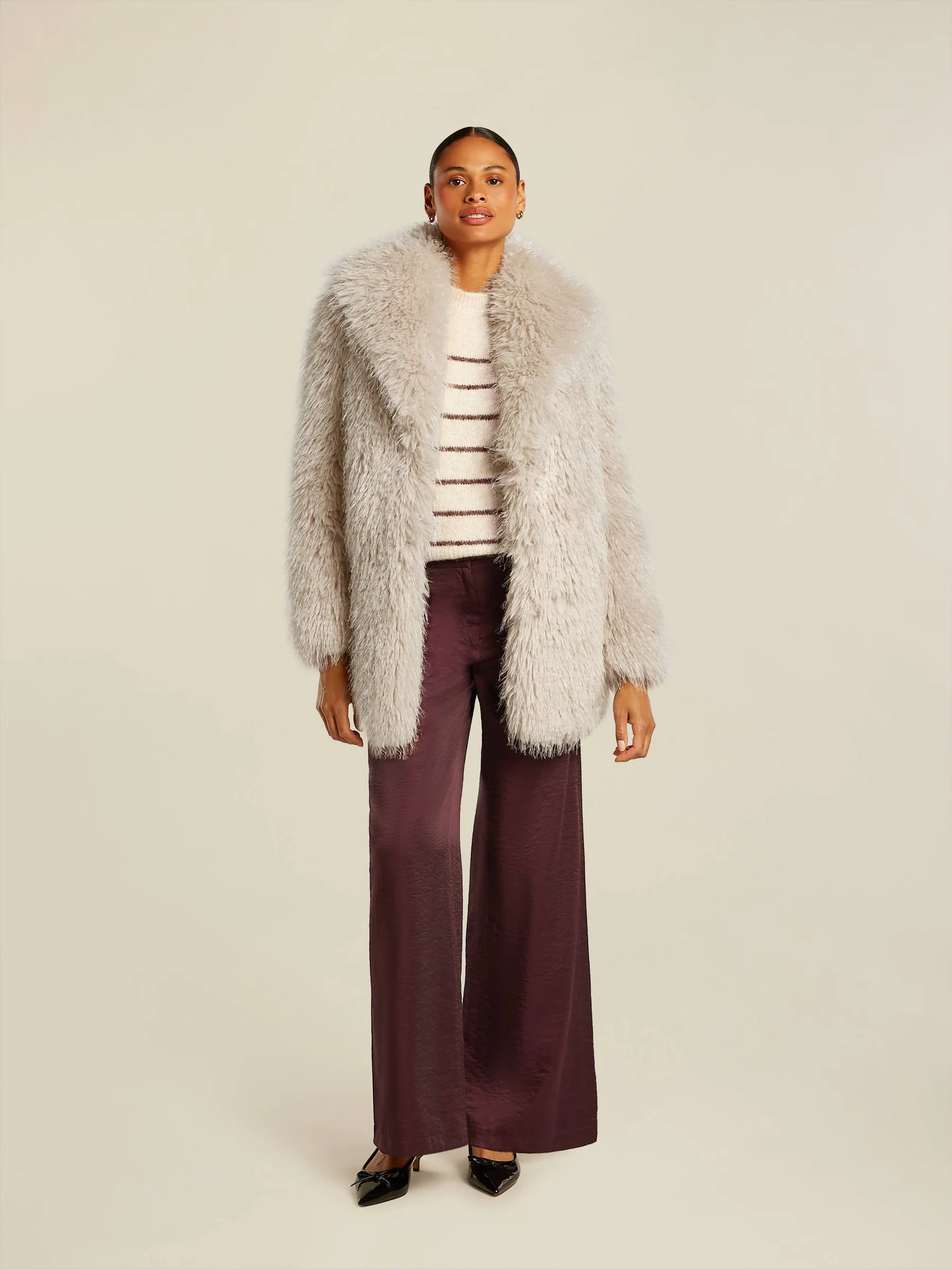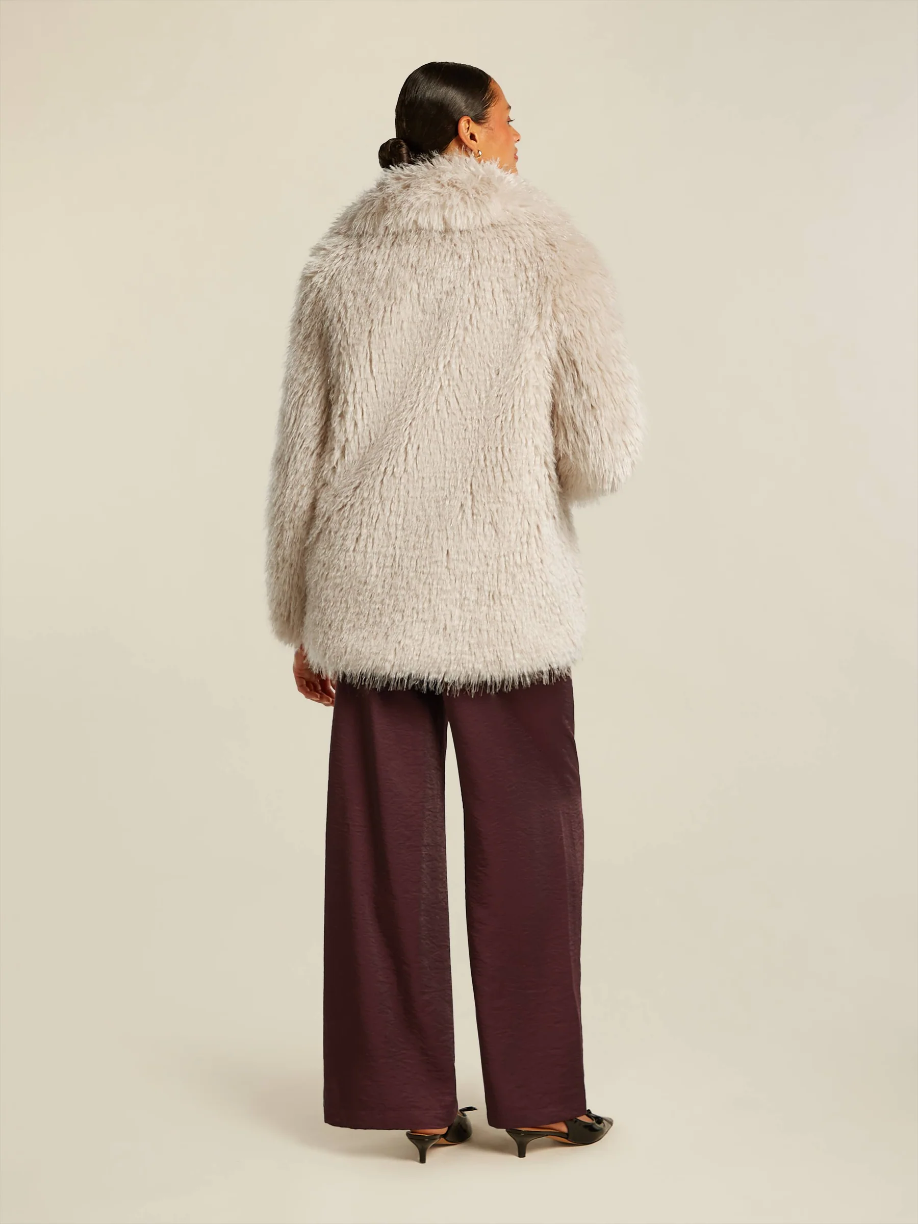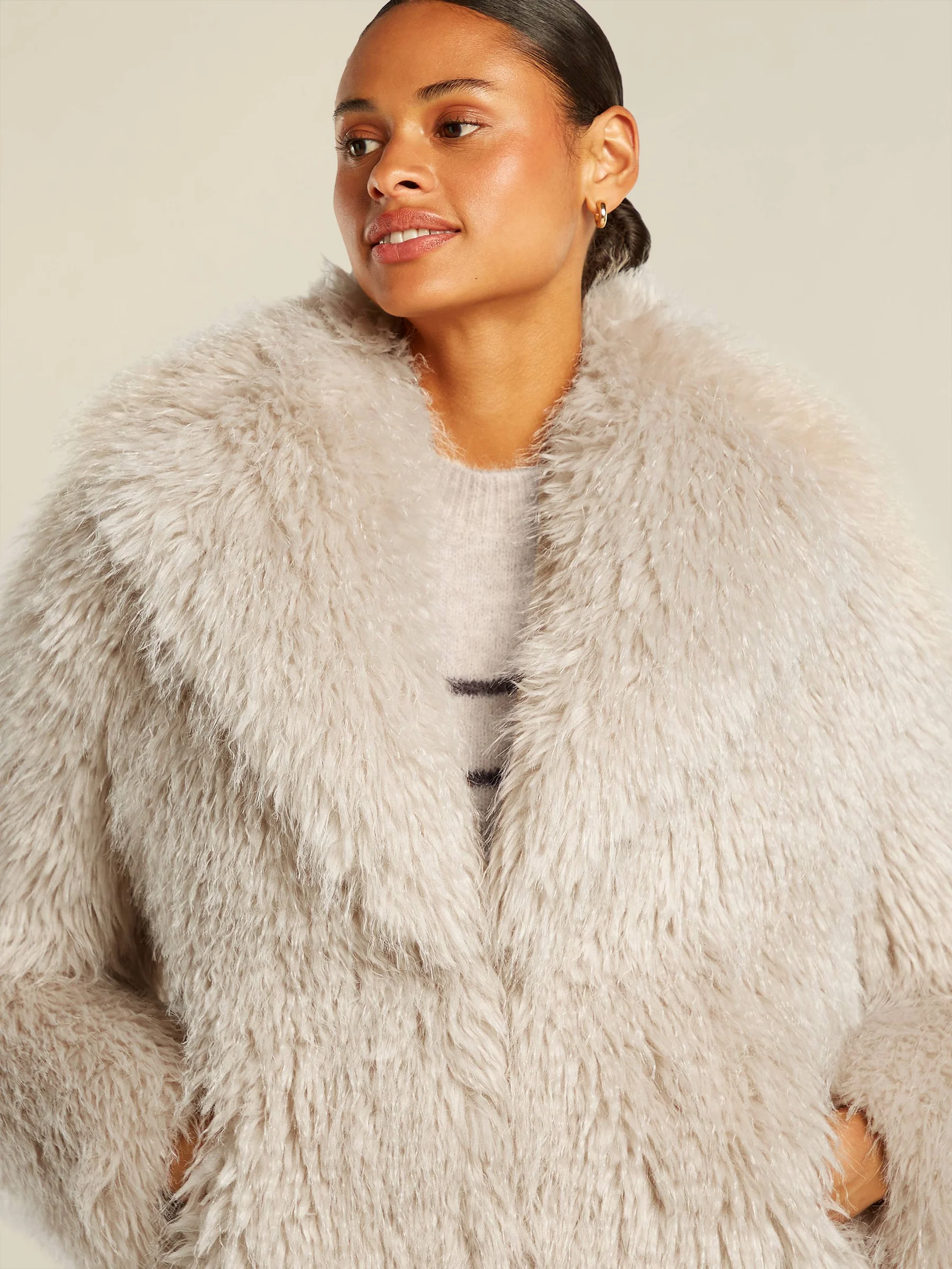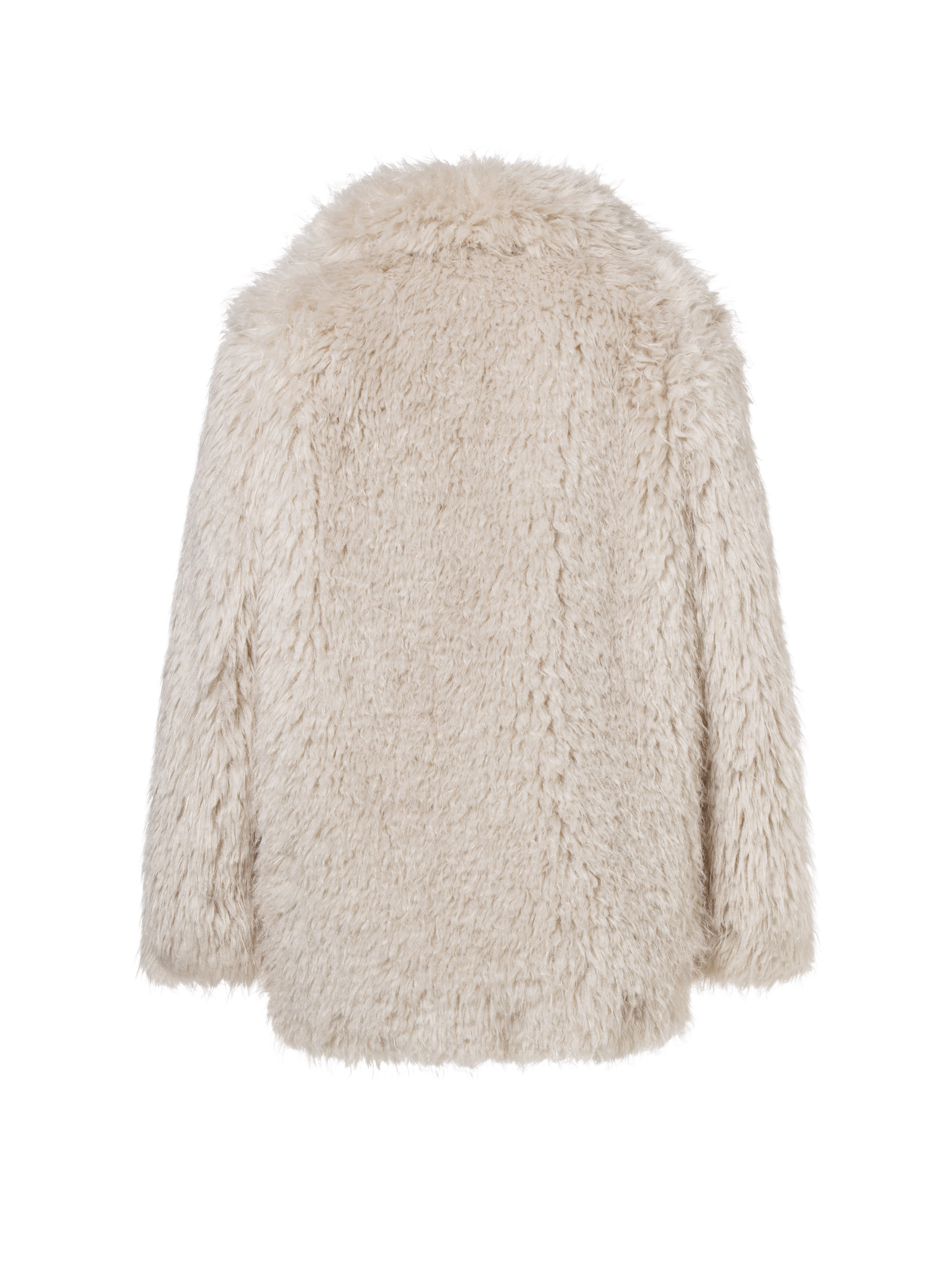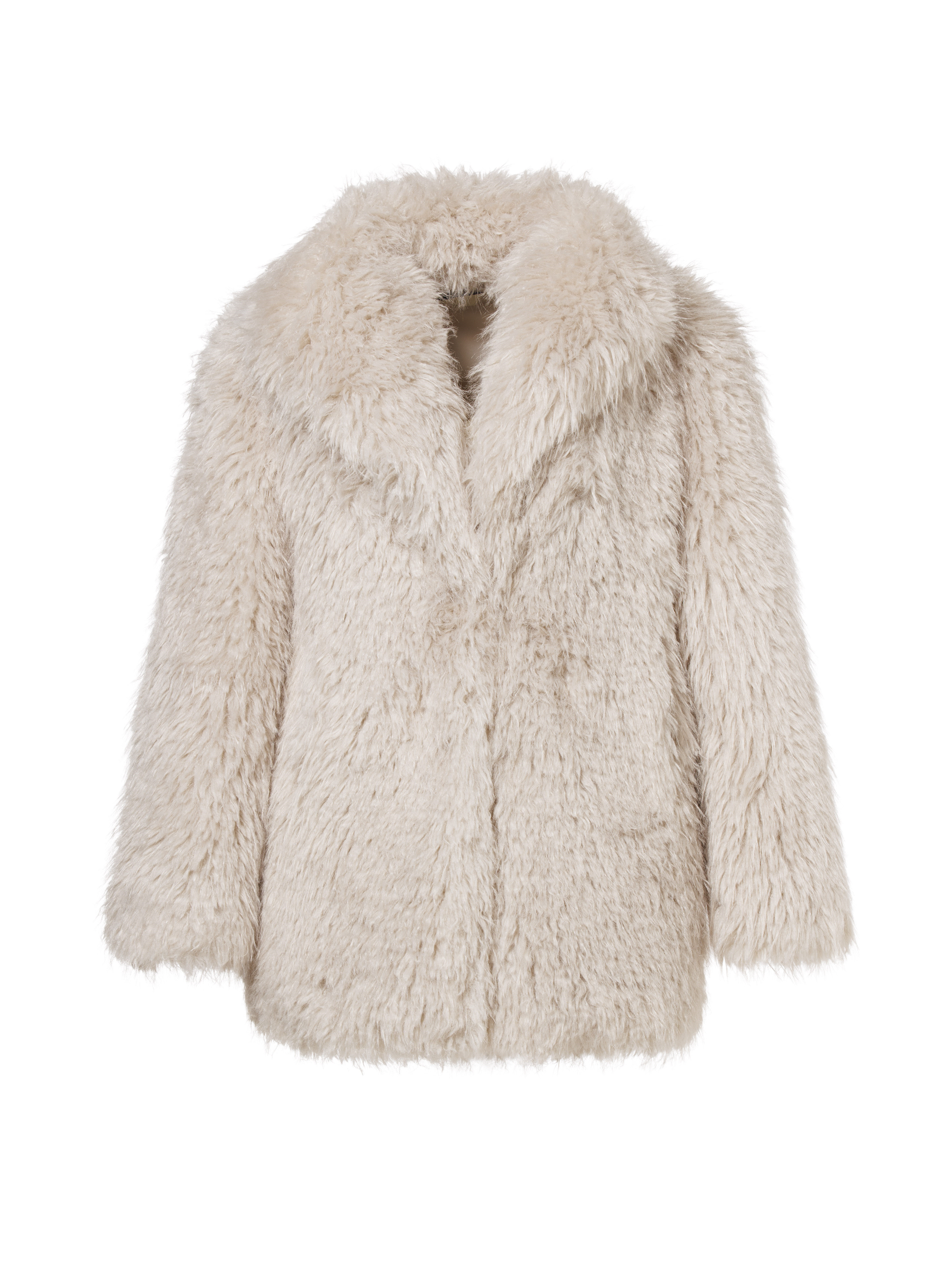 100% recycled polyester (faux fur) 100% polyester (faux suede) Měkký a chlupatý kabát z umělé kožešiny, délka po boky Plně podšitý s vnitřní kapsou Přední zapínání na háčky a očka Délka zadního středu: 75 cm Materiál: 100 % recyklovaný polyester Střih: Tento model má regular střih Podšívka: 100 % recyklovaný polyester Péče: neprát, nebělit, nesušit v sušičce, nežehlit Chemické čištění P