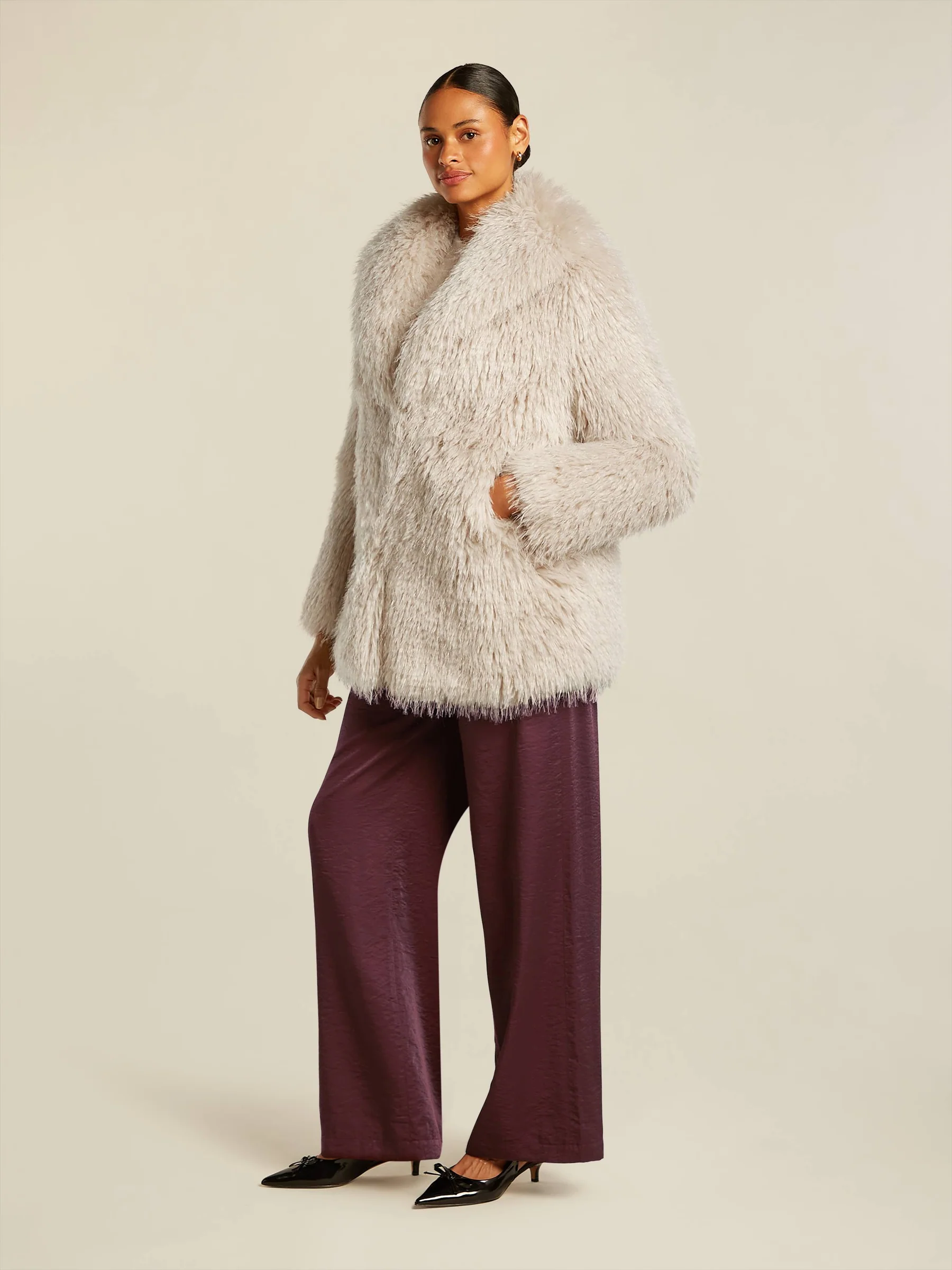 Měkký a chlupatý kabát z umělé kožešiny, délka po boky