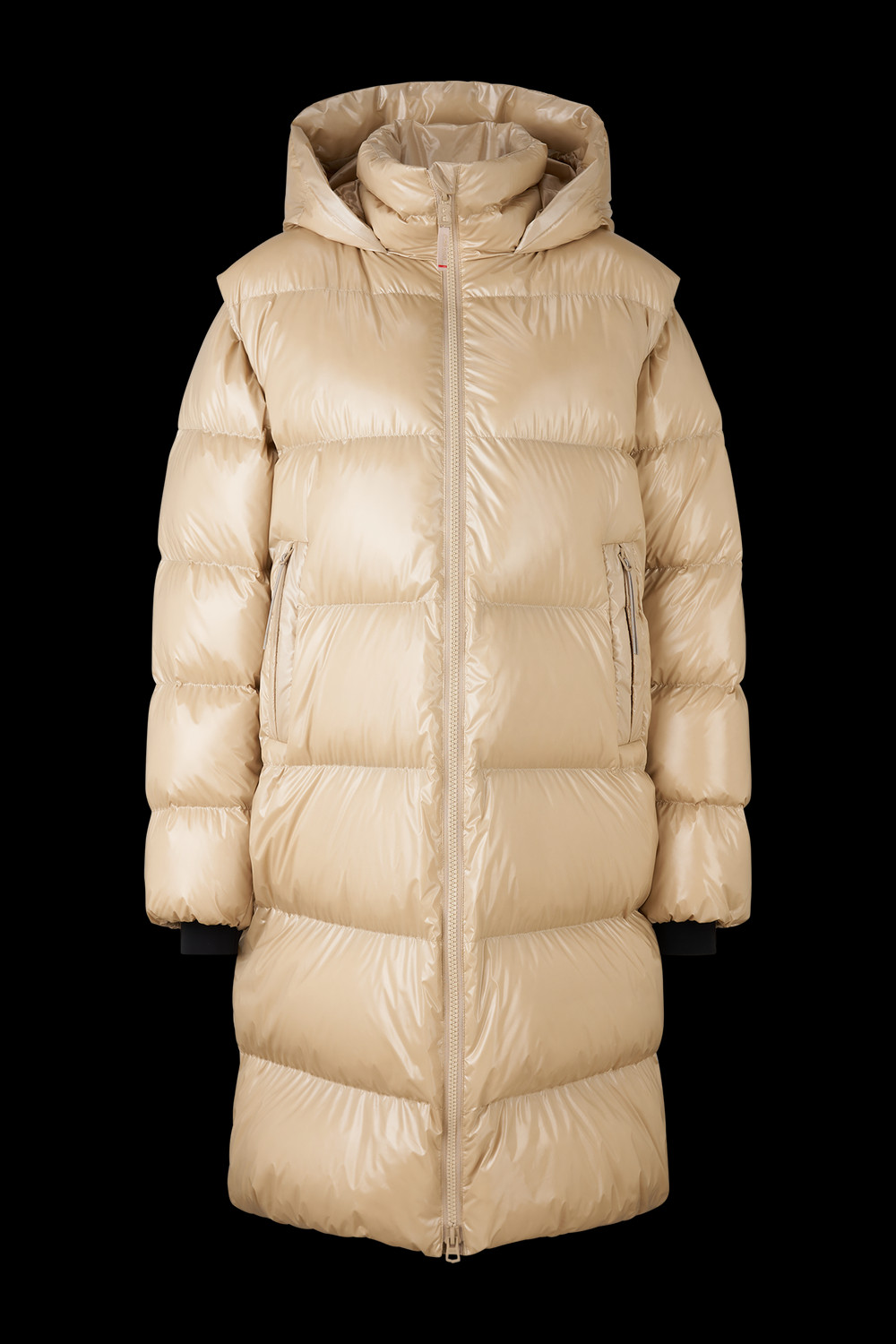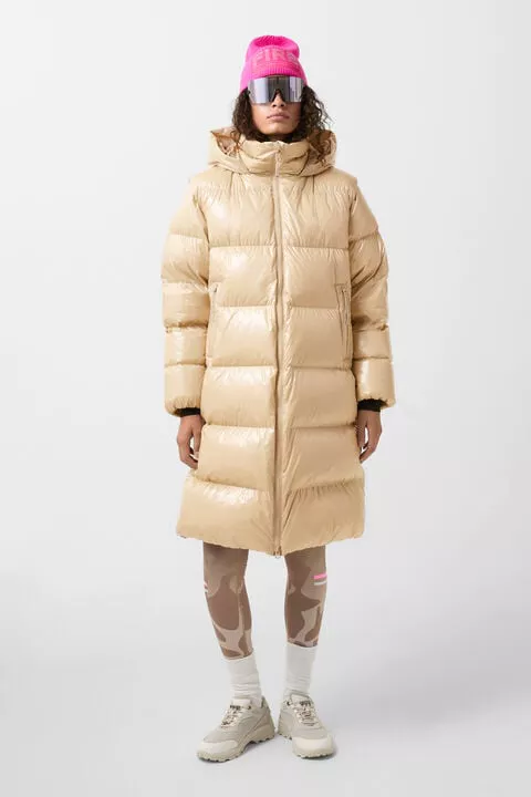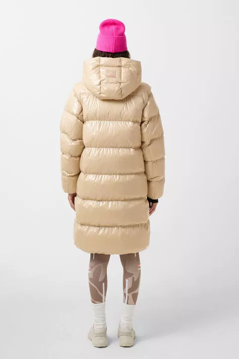 Prošívaný péřový kabát v regular střihu; Polstrovaný stojáček; Pevná kapuce se stahovací šňůrkou a zarážkou; Odnímatelné dlouhé rukávy; Elastické manžety s vloženými manžetami; Podložený dvoucestný zip s přívěskem B; Dvě skryté kapsy na zip po stranách; Jedna vnitřní