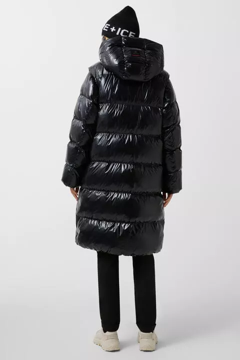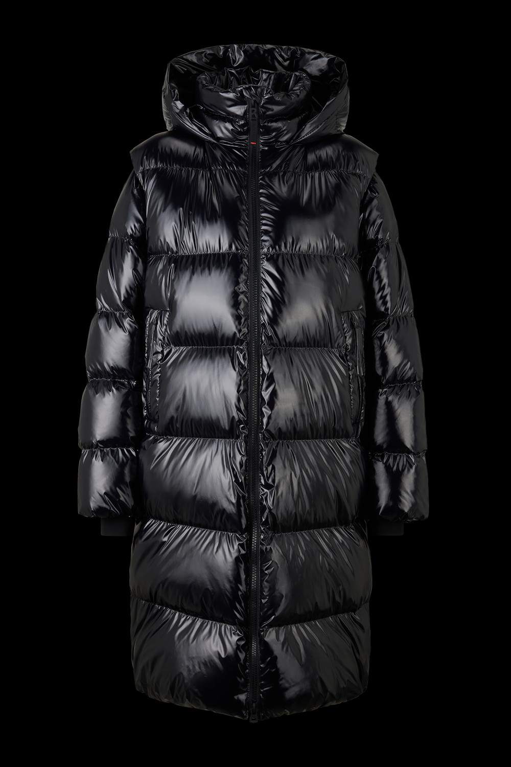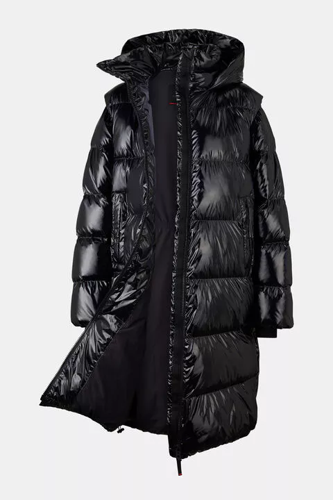 Prošívaný péřový kabát v regular střihu; Polstrovaný stojáček; Pevná kapuce se stahovací šňůrkou a zarážkou; Odnímatelné dlouhé rukávy; Elastické manžety s vloženými manžetami; Podložený dvoucestný zip s přívěskem B; Dvě skryté kapsy na zip po stranách; Jedna vnitřní