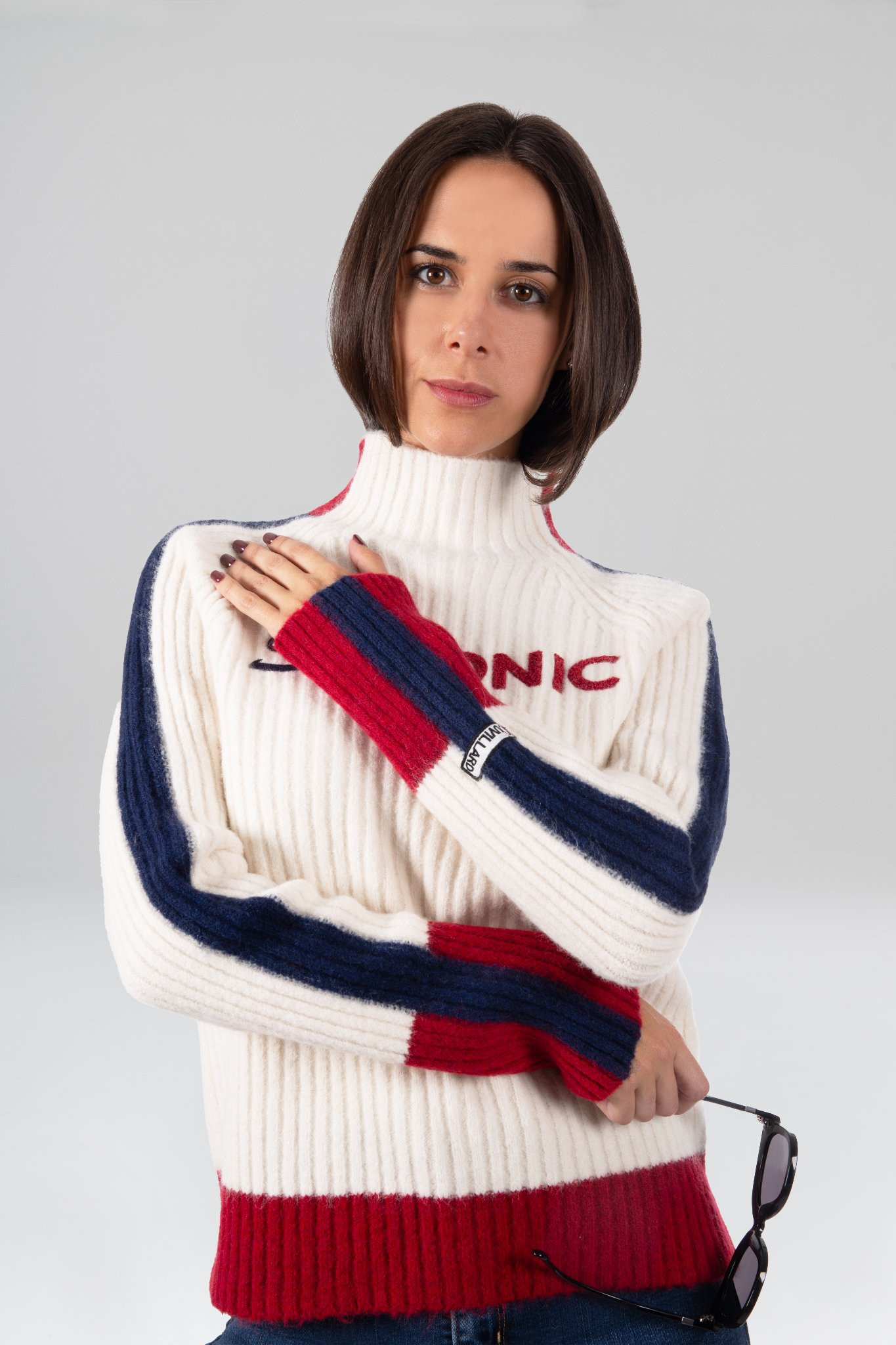 Popis:Svetr POLA2: Odvážný vintage styl s nápisem „SKI TONIC“ na bouclé úpletu