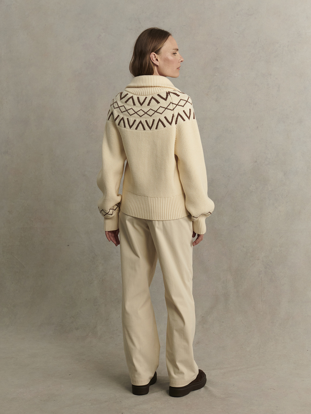 Dopřejte svému zimnímu šatníku další stylový kousek v podobě modelu Sigrid, měkkého svetru s polovičním zipem a vzorem Fair Isle.
