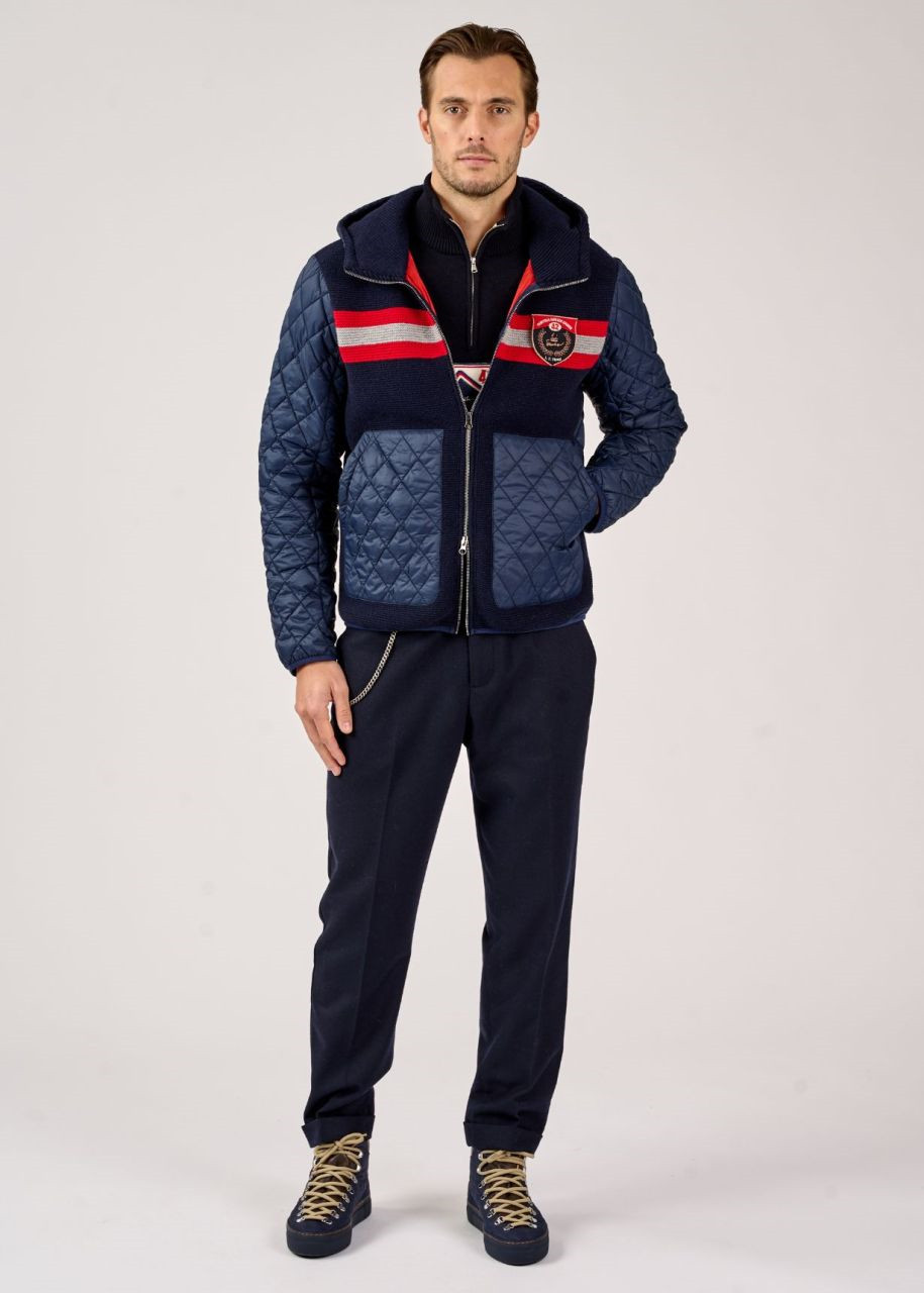 Zvláštnosti: Nylon s vodoodpudivou funkcí, pletená přední část s horizontálními pruhy v kontrastní barvě, lehká výplň, prošívání ve tvaru kosočtverce, kapuce se stahovací šňůrkou, nášivka s ikonickým startovním číslem 42 Luis Trenker jako ozdoba na levé straně hrudníku