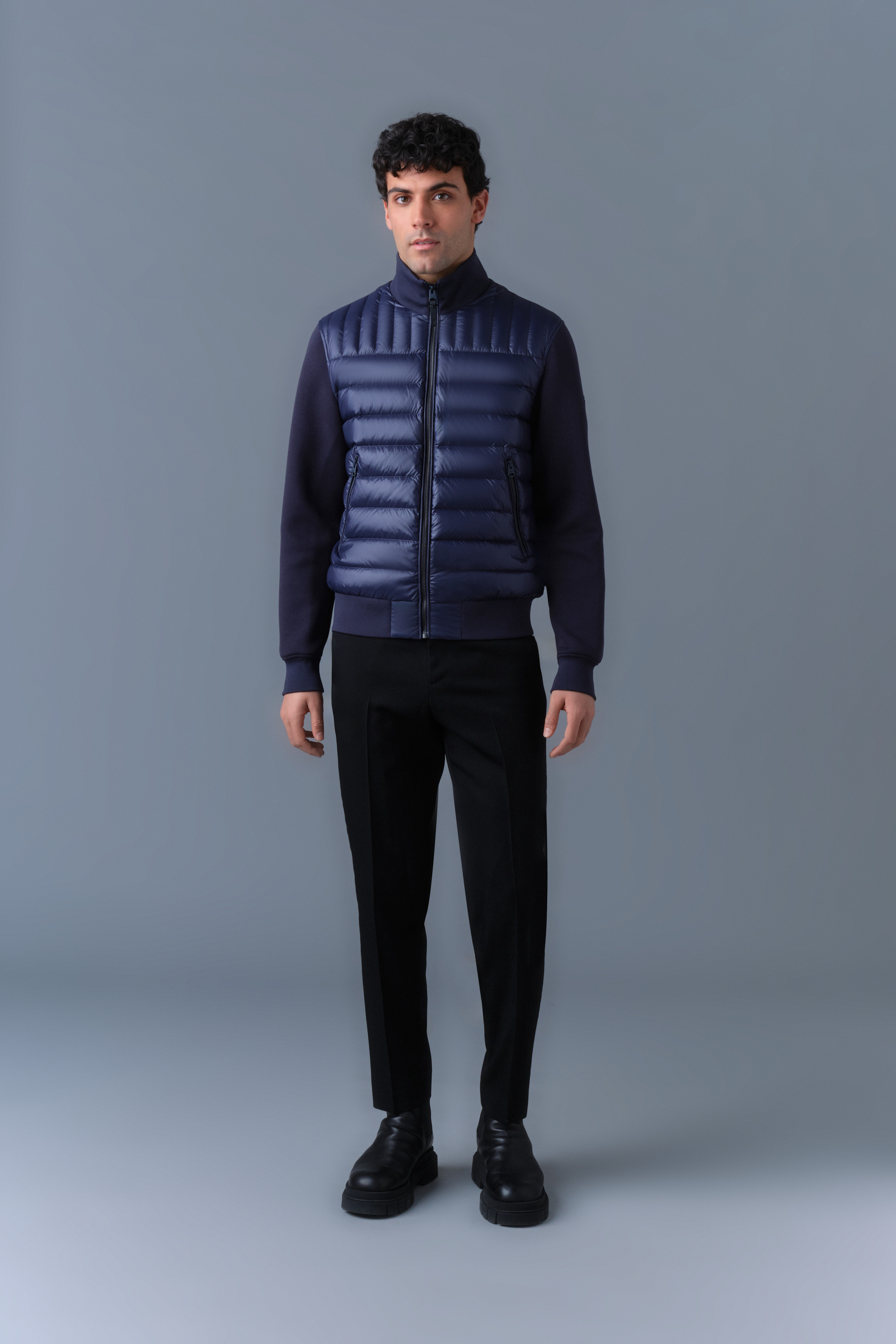 **COLLIN-R** je pánská přechodová bunda v klasickém bomber stylu. Precizně střižená do slim fit siluety, kombinuje přední díl z recyklovaného lesklého nano peří s rukávy a zadním dílem z měkkého oboustranného žerzeje. Žebrovaný stojáček a lemy přidávají na funkčních detailech a hřejivosti. Moderní více-sezónní vrstva s nenuceným stylem.