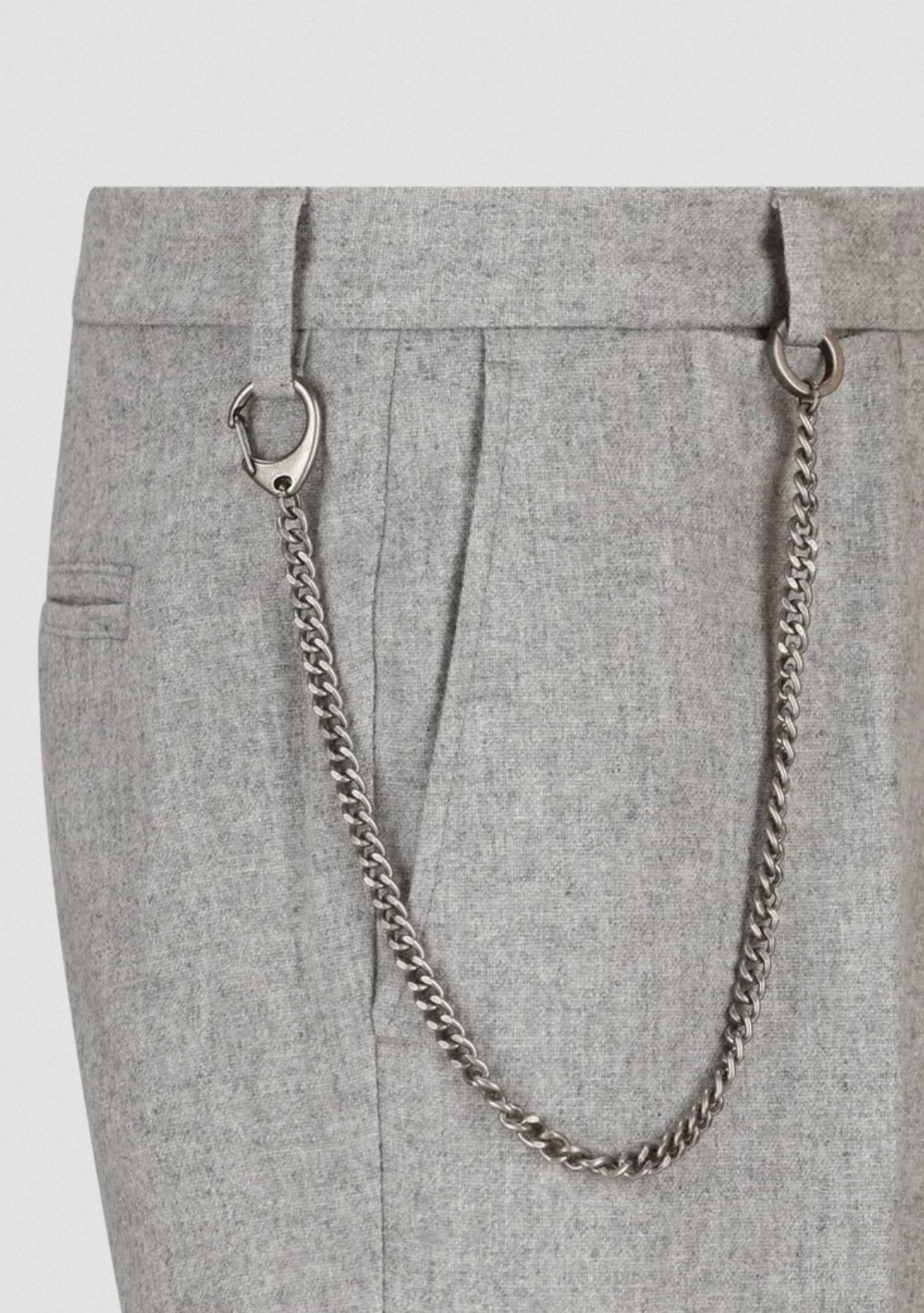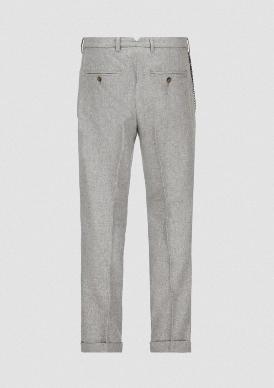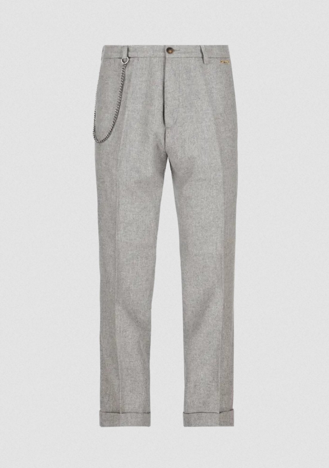 Tyto italské kalhoty s pravidelným střihem, mírně širšími nohavicemi, pukem a manžetami jsou vyrobeny z pohodlné flanelové směsi vlny. Odnímatelný ozdobný řetízek na poutkách opasku je originálním detailem, který tento model odlišuje.
