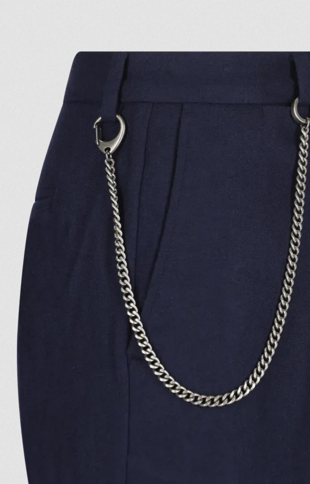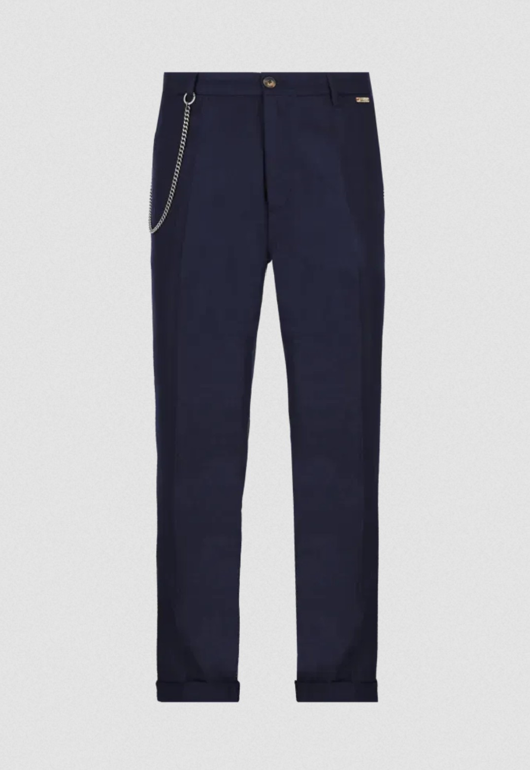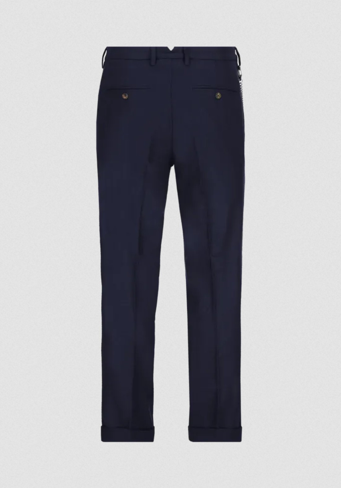 Tyto italské kalhoty s pravidelným střihem, mírně širšími nohavicemi, pukem a manžetami jsou vyrobeny z pohodlné flanelové směsi vlny. Odnímatelný ozdobný řetízek na poutkách opasku je originálním detailem, který tento model odlišuje.