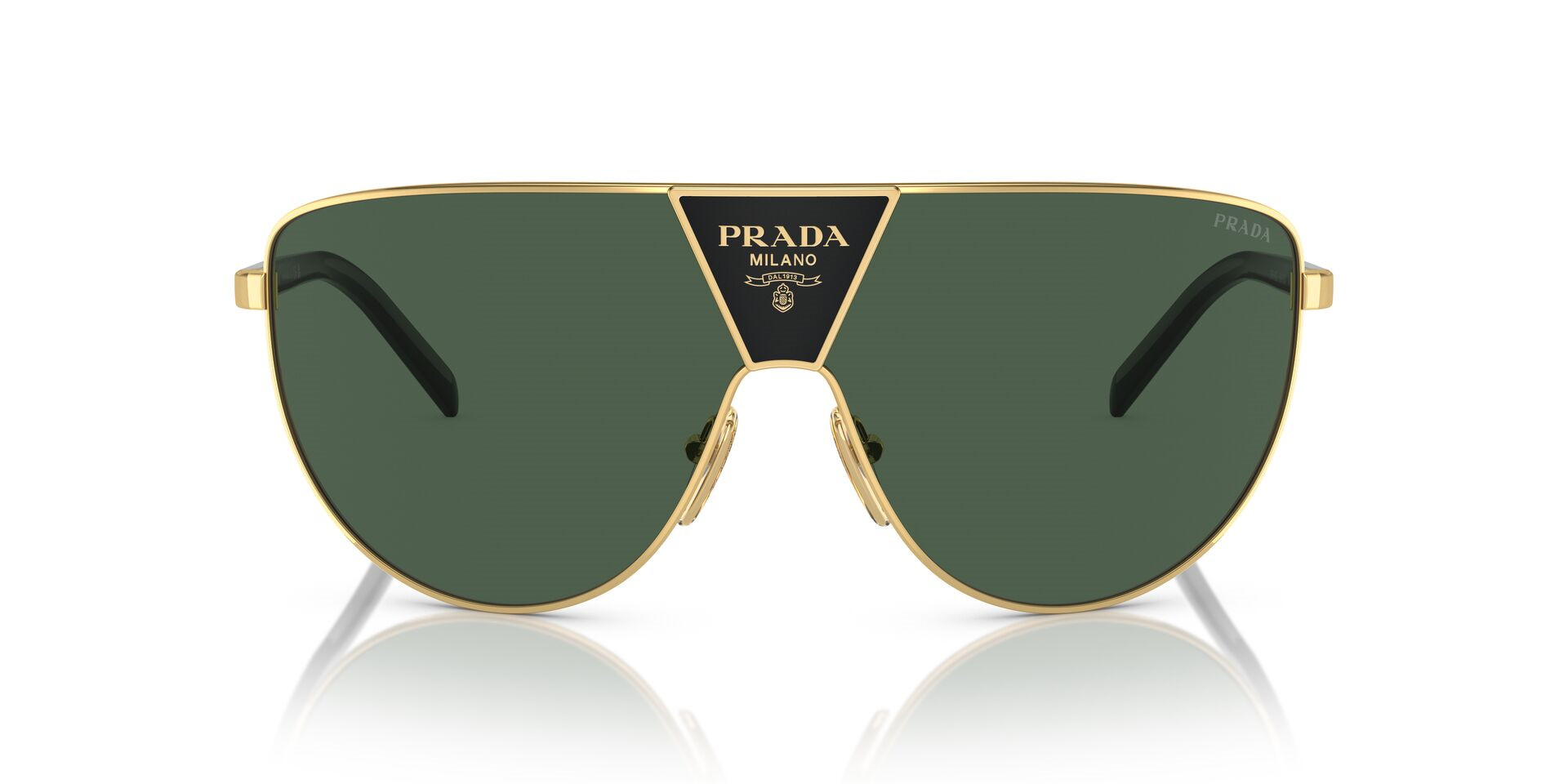 kovové pánské sluneční brýlePrada představuje novou generaci slunečních brýlí, které povyšují ikonický obdélníkový kovový rám. Tento styl je vyroben ve zlaté barvě se zelenými skly a nabízí sofistikovanost i funkčnost. Jednobarevná úprava čoček dodává další nádech elegance a zároveň zajišťuje optimální ochranu před sluncem. Tyto sluneční brýle, které povyšuje obdélníkový kovový rám a jedinečné designové detaily, představují nadčasový půvab spojený s moderním stylem. K dispozici s technologií zvýraznění kontrastu čoček.